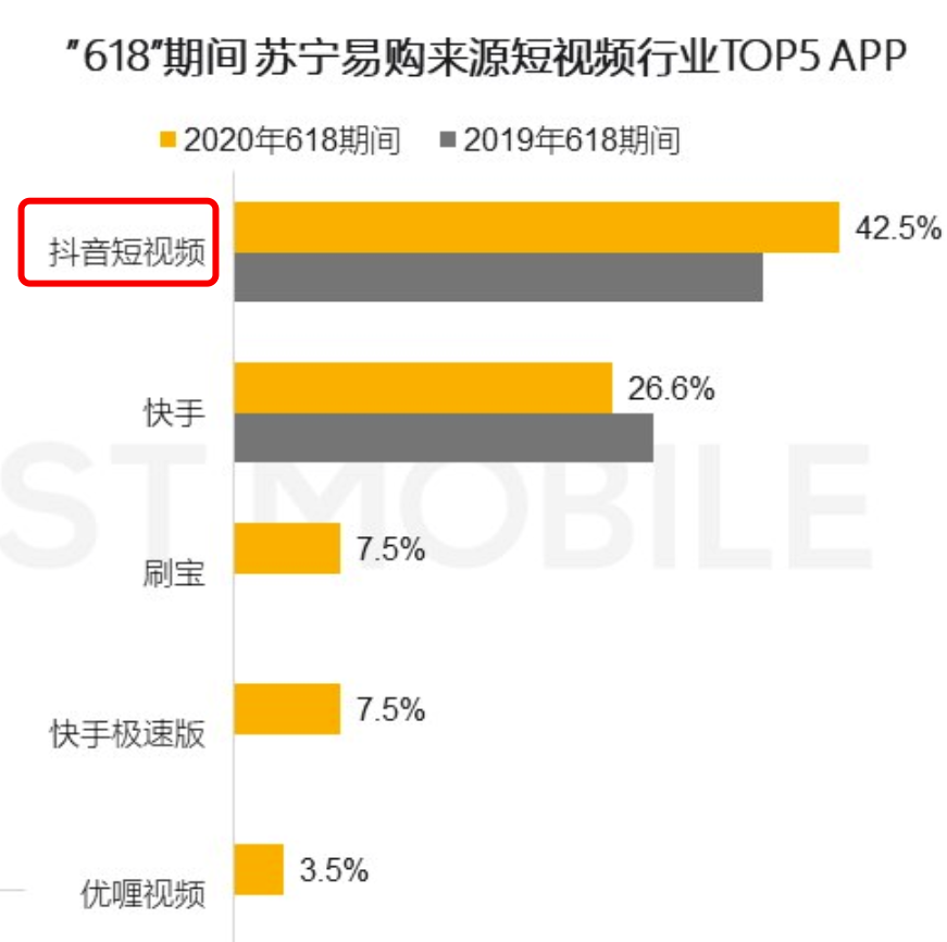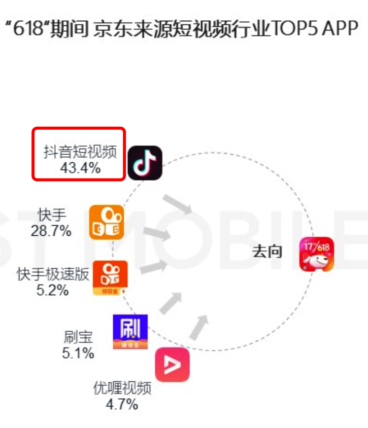 一个是国内最大的电商平台,另一个日活破4亿的短视频平台。QuestMobile2020 “618”电商洞察报告显示,抖音是京东和苏宁流量来源最大的短视频平台,前者占比43.3%,后者为42.5%,抖音已经成为电商平台引流的强势入口。