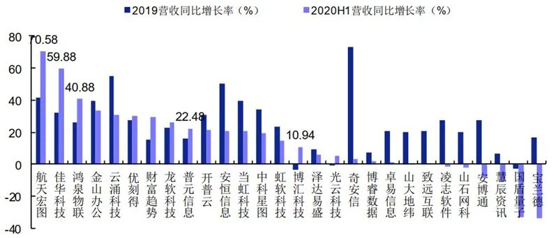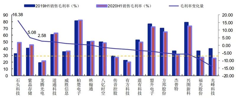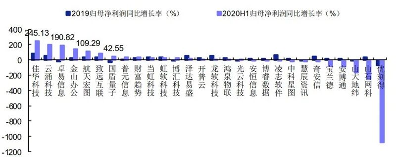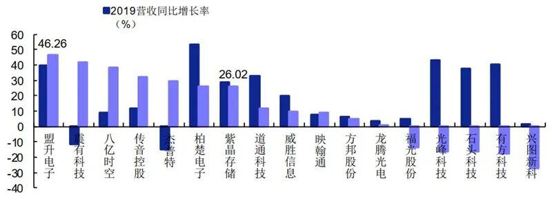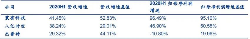 从利润增长角度来看,硬件设备行业也有增长迅猛的企业,龙腾光电、震有科技、紫晶存储、盟升电子、八亿时空等公司在 2020 年上半年创造了 45%以上的增长率。