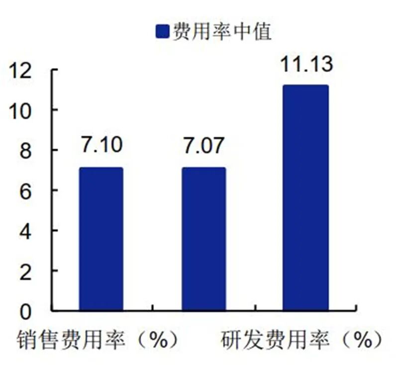 计算机行业研发费用率中值为 23.20%,销售费用率中值为 14.47%,管理费用率中值为10.94%,综合费用率较高,体现了软件行业人力成本较高的特征。该行业内研发费用率和管理费用率最高的公司同为国盾量子,其研发费用率为 131.20%,管理费用率为 239.47%。销售费用率最高的是奇安信,达到 60.84%。计算机行业内有 7 家公司销售费用率在 40%以上,明显高于半导体行业。