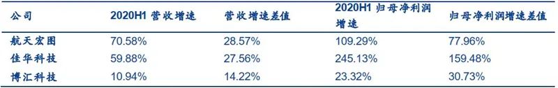 而计算机行业满足营收增速差值在 10%以上的公司只有航天宏图、佳华科技、鸿泉物联、财富趋势、博汇科技 5 家。利润增速差值在 30%以上的则有佳华科技、云涌科技、卓易信息、金山办公、航天宏图、致远互联、国盾量子、普元信息、博汇科技 9 家公司。同时满足以上两个条件的公司则只有航天宏图、佳华科技、博汇科技 3 家。航天宏图主要产品为遥感信息处理软件,与北斗有一定关联,可能受近期北斗组网完成需求推动。佳华科技业务主要包括环保物联网、建筑智能化等领域。博汇科技业务主要包括视听业务运维、视听数据管理、媒体内容安全等,或与疫情期间互联网平台音视频需求增加有关。此外计算机领域部分公司表现出利润大幅增长而营收增长幅度较小的特征,例如与远程办公有关的金山办公、云计算中间件领域的普元信息、为云计算设备开发 BIOS 等固件的卓易信息、信息安全领域的云涌科技等。