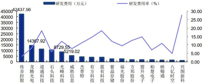 硬件设备行业研发费用最高的是传音控股,其研发费用达 4.2 亿元,几乎是第二名的三倍。该行业内研发费用前六名在 5000 万元以上,其他 11 家企业研发费用在 5000 万元以下。