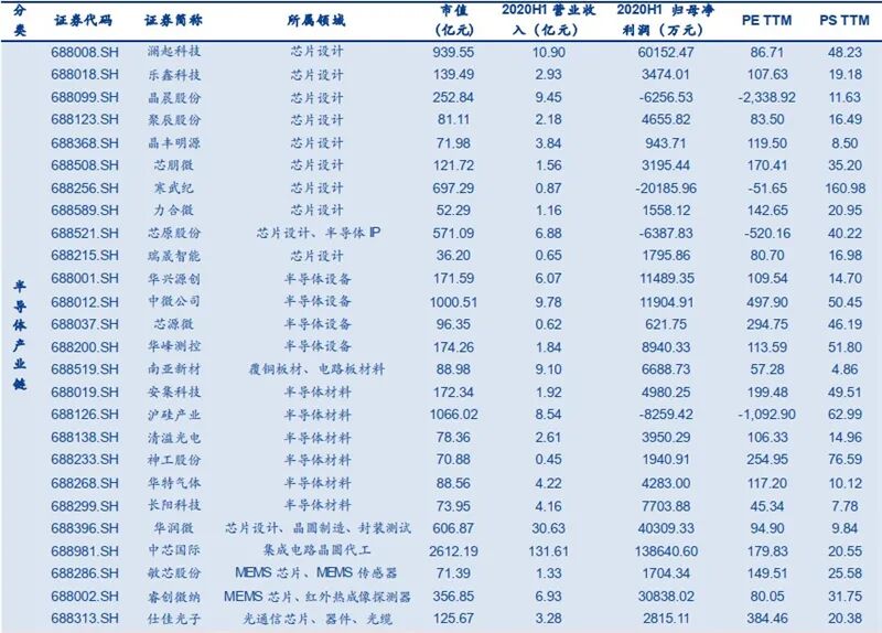 科创板 TMT 行业中的半导体行业公司覆盖了上游的半导体设备、半导体材料、芯片 IP,到中游的芯片设计、芯片制造,基本把产业链的大部分涵盖在其中。科创板目前已成为半导体公司上市的聚集地。