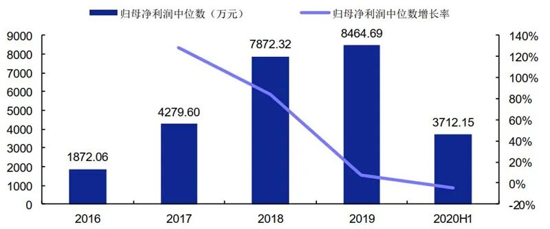 ▲2016-2020H1 计算机公司的归母净利润中位数情况