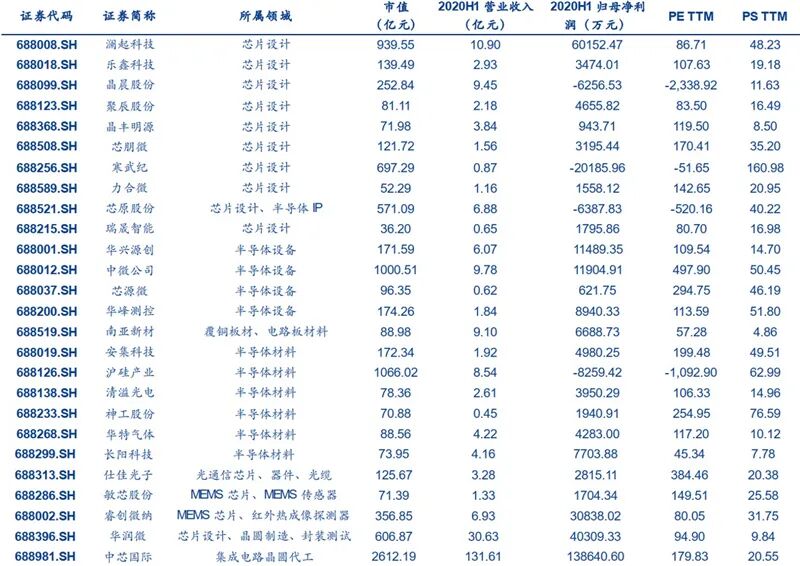 分公司来看,中芯国际以 13.86 亿元净利润坐稳头把交椅,澜起科技在 2020H1 排名第二,净利润超过 6 亿,第三名的华润微电子归母净利润 4.03 亿元,第四的睿创微纳归母净利润达到 3.08 亿元。其他公司净利润均在 1.2 亿元以下。