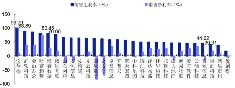 计算机行业毛利率中值为 56.75%,高于半导体行业,并且几乎所有公司毛利率水平均保持在 40%以上,体现了计算机软件行业高毛利的特点。该行业毛利率最高的宝兰德,其毛利率可达 99.79%。该行业净利率最高的是财富趋势,达到 75.39%,这一数据在所有科创板 TMT公司中排名第一,同时该公司毛利率也达到了 80.53%,位居前列。计算机软件行业共 6 家公司毛利率在 70%以上,3 家在 40%以下,其余 19 家都处在 40%-70%之间。