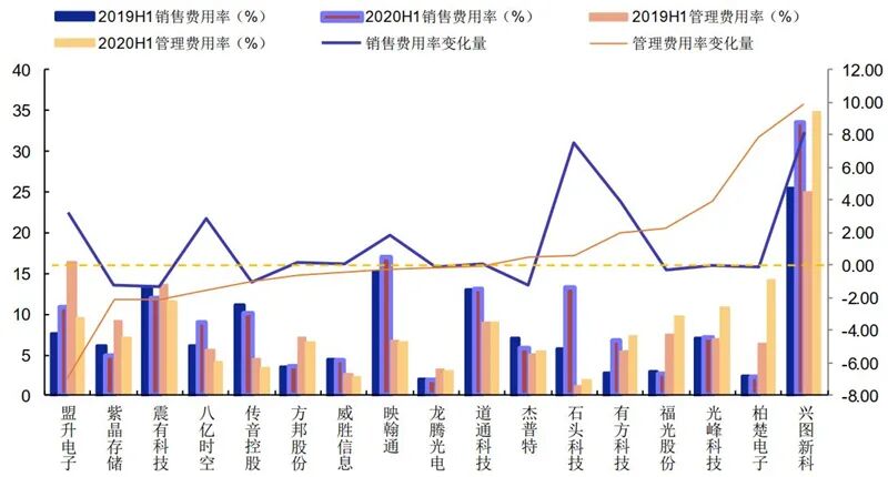 从费用角度来看,2020H1 TMT 公司费用率中值接近 30%,其中近半都是研发费用,体现了科创板的特色。销售费用和管理费用水平相近。