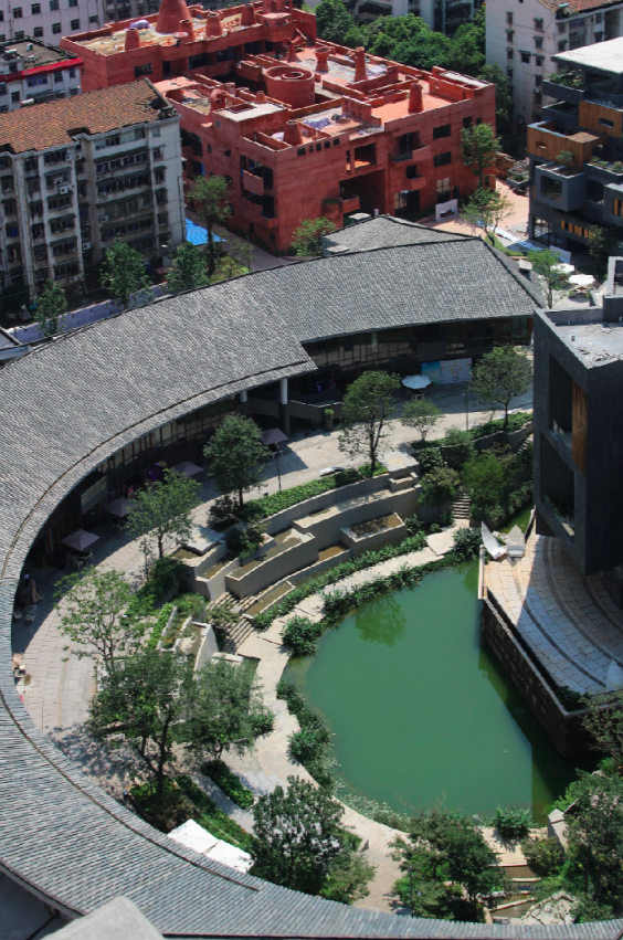 其次,老西门项目对于如何营造培育社会生态的湿件系统,有着高度的自觉和精心的系统化安排:1. 在回迁楼底层设计了一条宽敞的外廊,把原本在棚户区摆摊数十年的老鞋匠、老裁缝、老理发师、配钥匙的老师傅等人重新请回社区,并让他们可以风雨无阻地出摊。很快,依托这些摊点,因改造而中断数年的原有社会生态被迅速修复如初;2. 在回迁楼围合的室外中庭,利用回收的传统建材修建了一个窨子屋会所,举办各类社区活动,雨天老人们在窨子屋的回廊中跳广场舞,一派其乐融融的景象;3. 利用会所顶部,设置了居民专属的二楼屋顶花园,可以让家长放心地把孩子放在这里玩耍,也增加了家长之间的交往机会;4. 在整个老西门区域内设计了7个不同类型的室外广场,给本地居民和外部访客提供了丰裕的交往和融合空间。