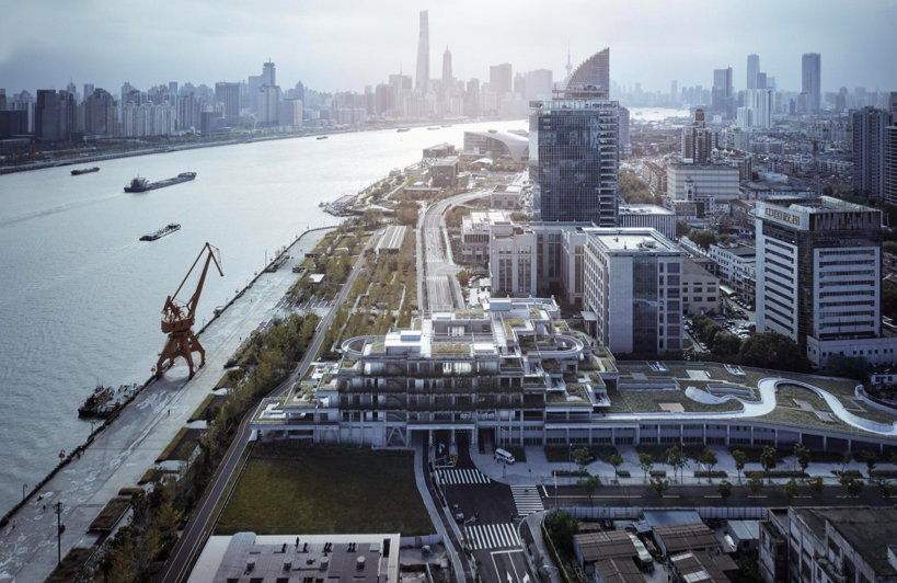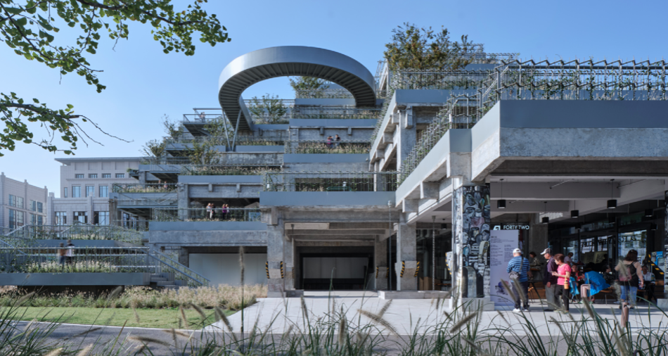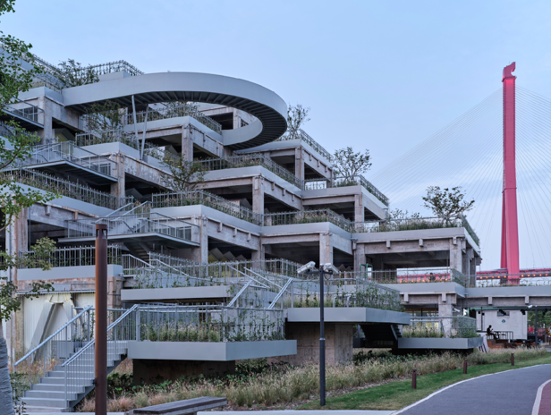 这座建筑的前身,是上海烟草集团的烟草仓库,由于与市政规划的车行道相冲突,政府原准备将其拆除。值此关键时刻,章明拿出了一个颇富创造性的改造方案——保留原有烟草仓库的基本结构框架,一、二层架空,保证车辆通行;三层开敞打通,成为联通江岸与城市腹地的人行过街天桥;建筑面向黄浦江一侧,被切削成逐层后退的多级台地,其上覆以植被,形成一个人造的绿化丘陵。