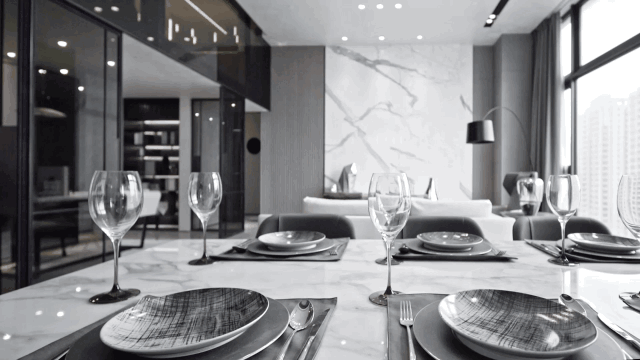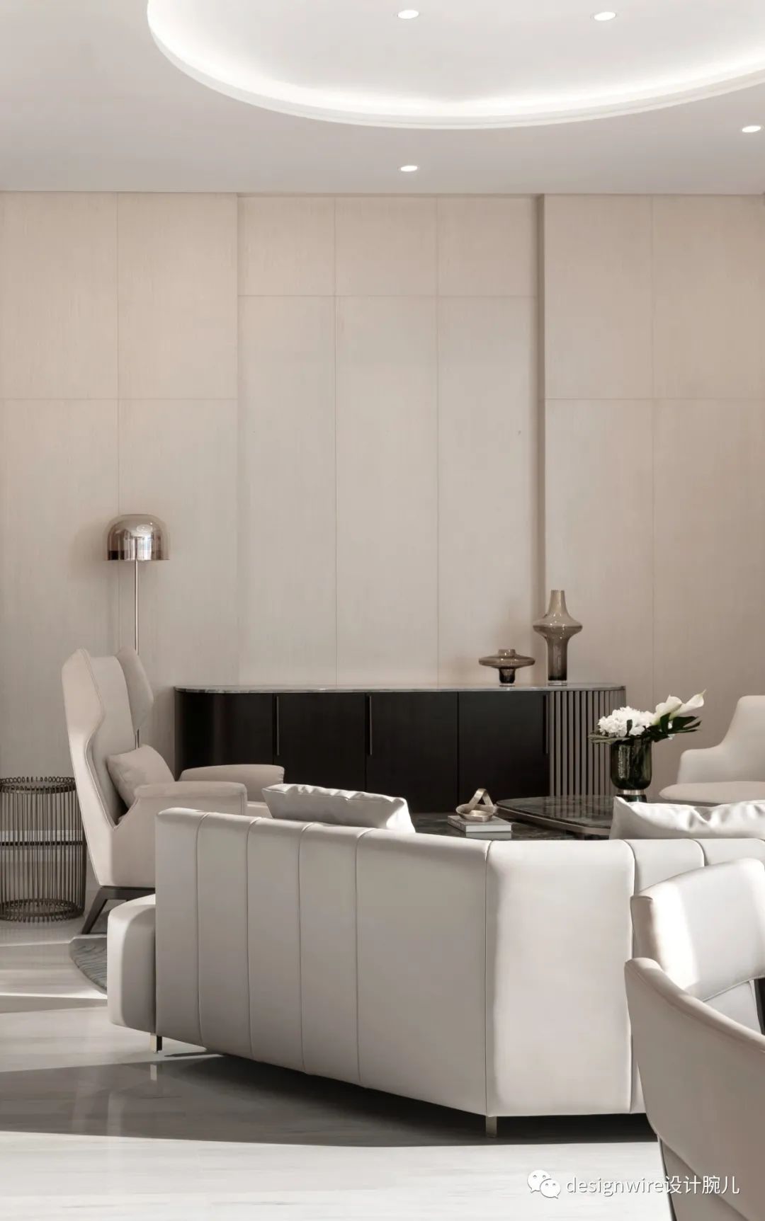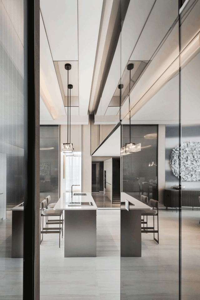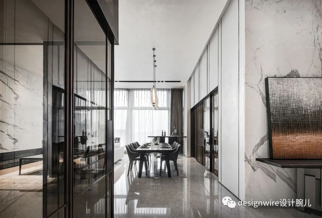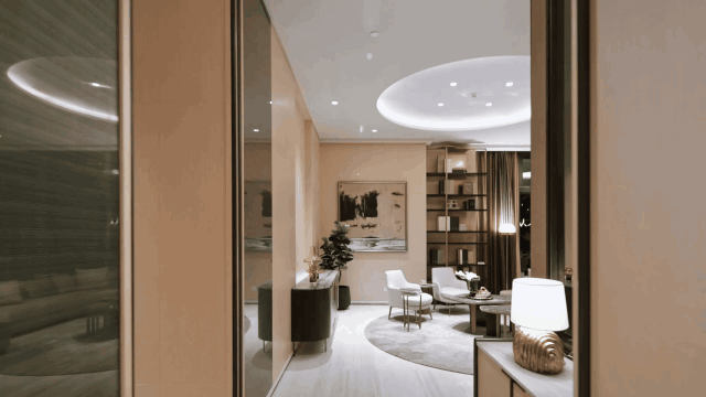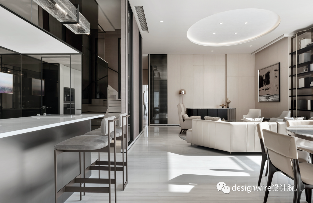 借东方礼序文化,入口处以“礼”为制,延长的进入动线,构置出尊贵的入户仪式感。进入敞阔的客餐厅,动态流动的空间随之展开,呼应建筑为生活的主题。