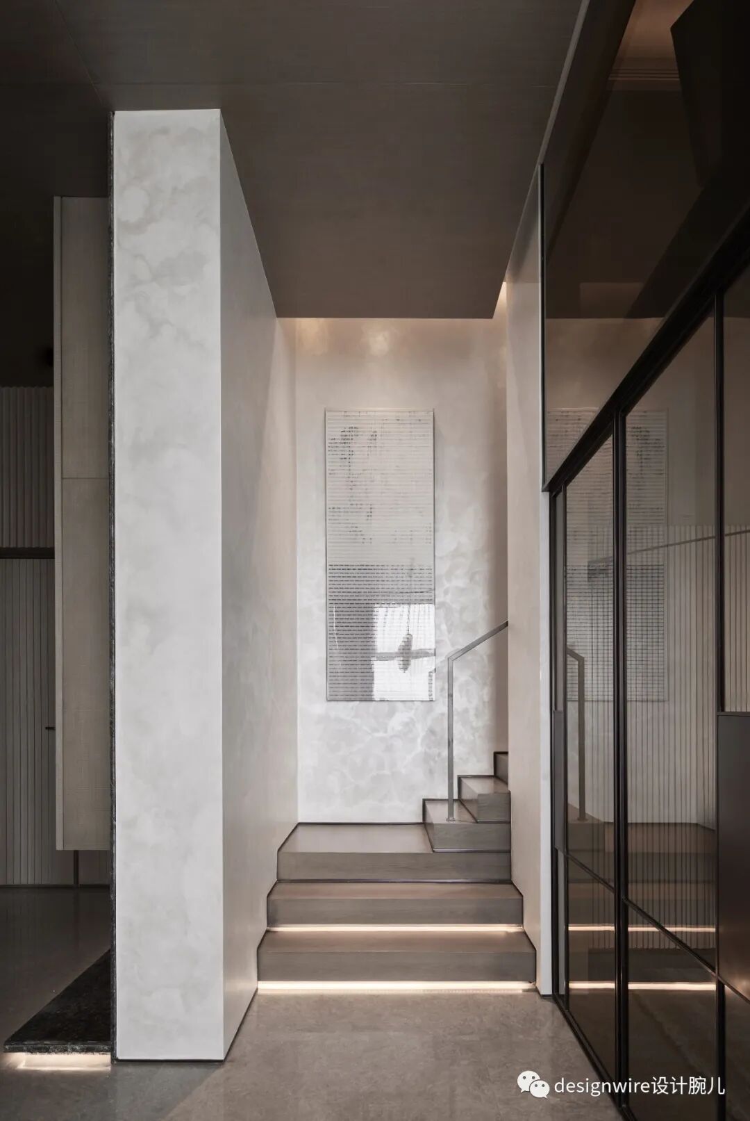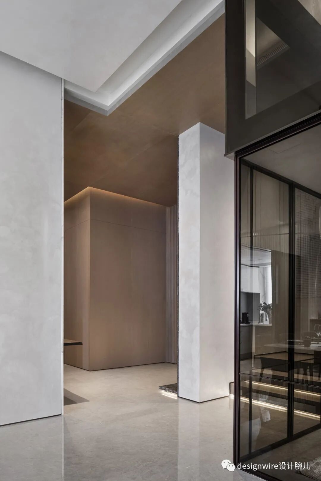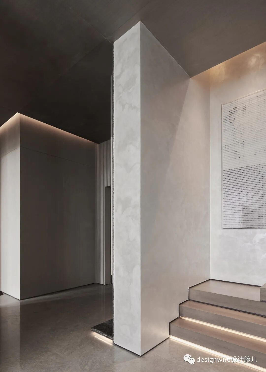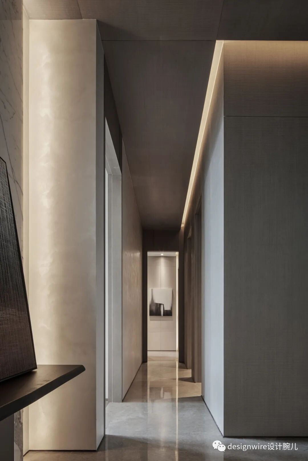 通往私密区域的廊道则以动静分离的手法,特设转换通道,保持视觉上的距离感。在结合空间自然的采光的同时,设计师分别运用基础灯和移动光源来渲染空间气氛,设置空间丰富表情。