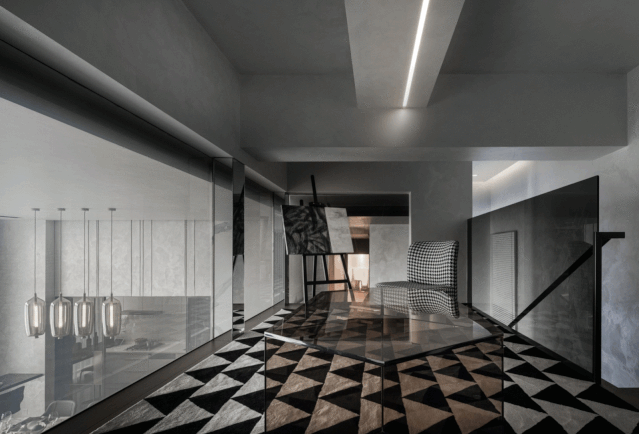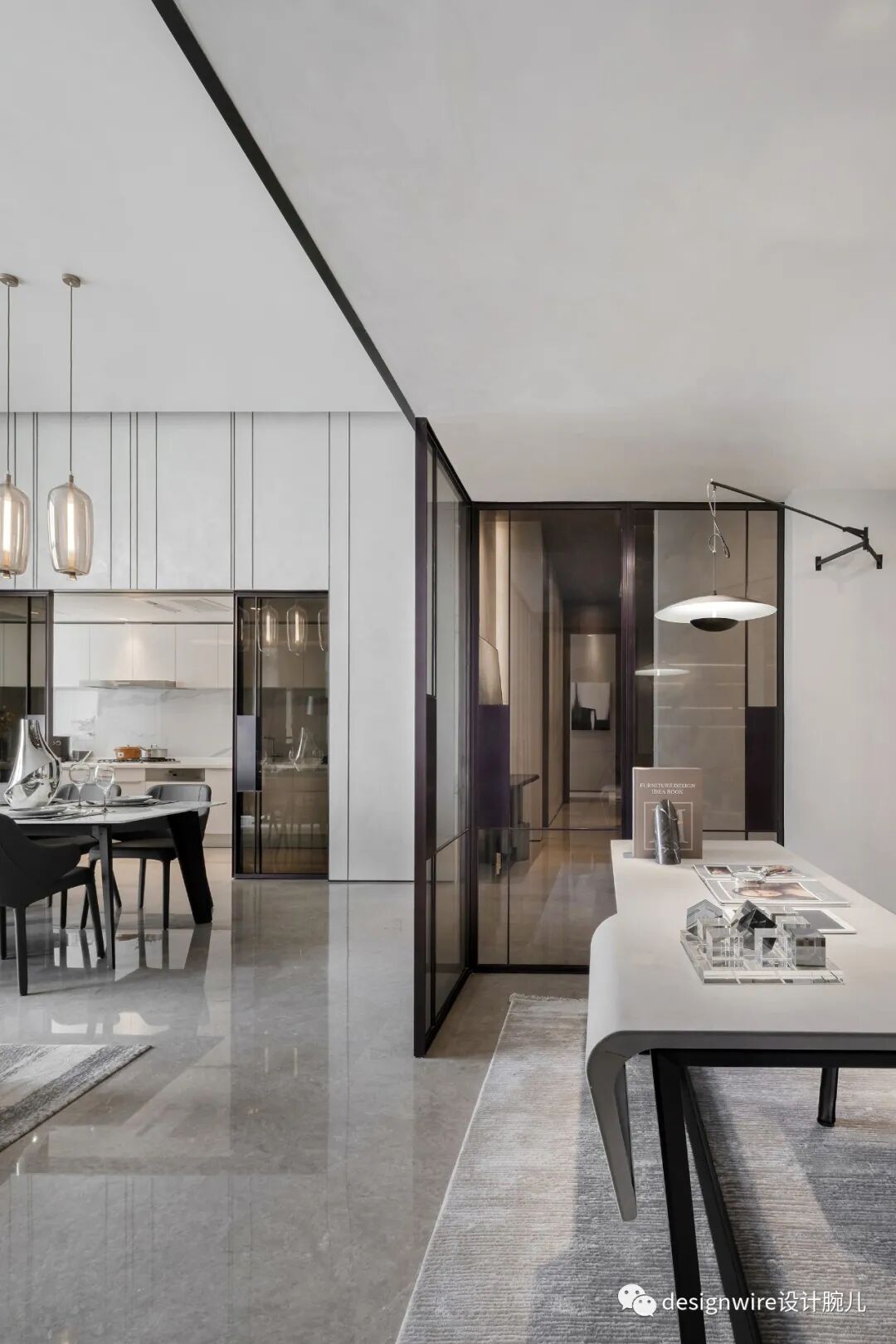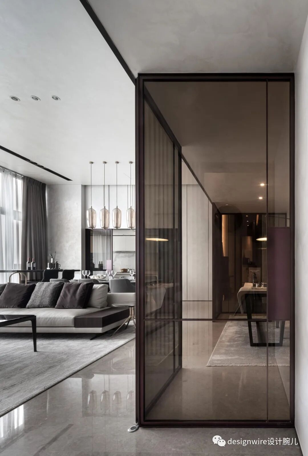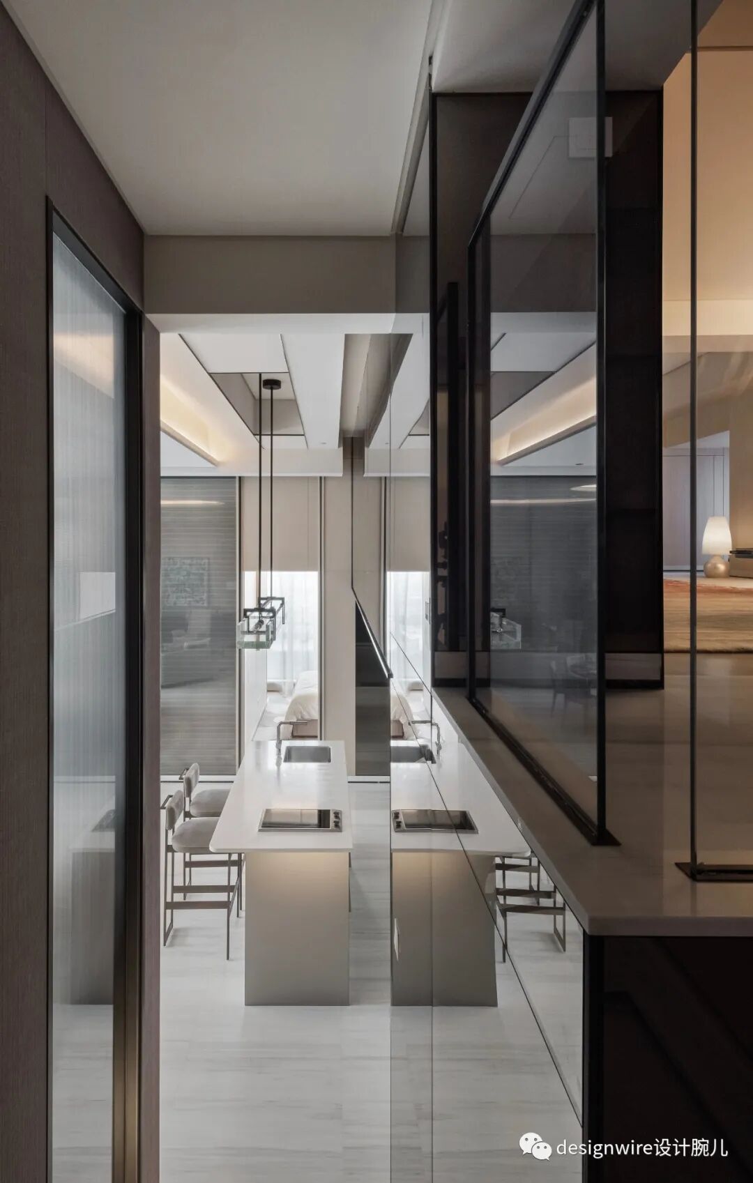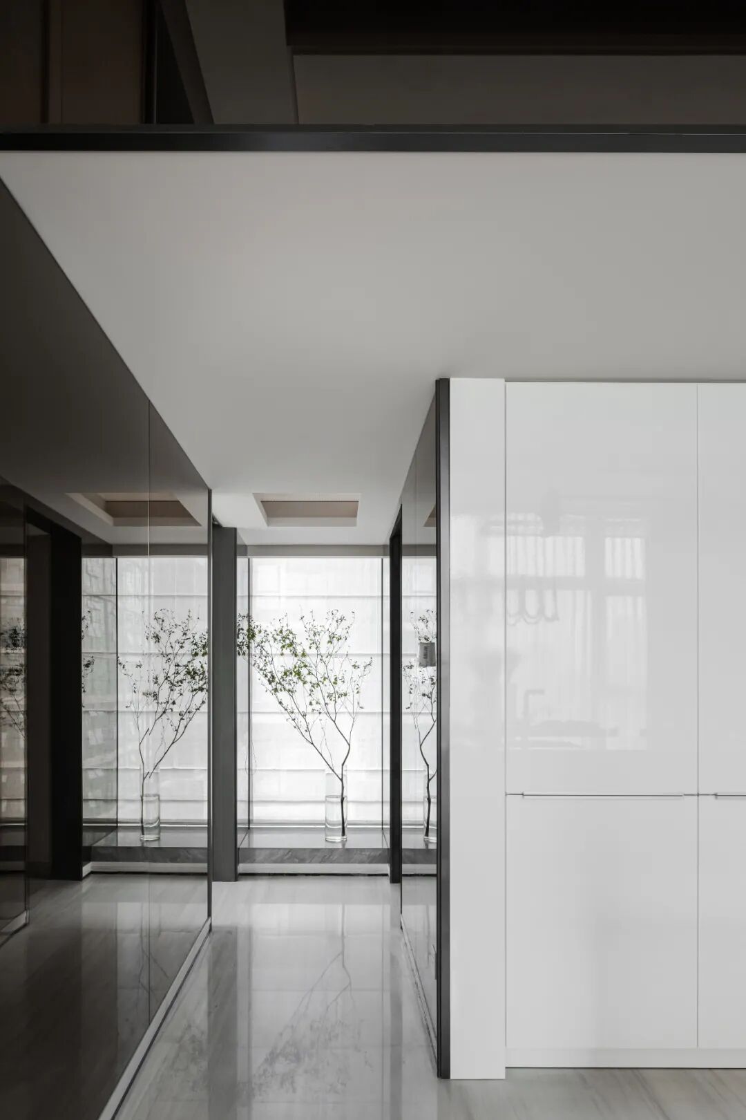 通往私密区域的廊道则以动静分离的手法,特设转换通道,保持视觉上的距离感。在结合空间自然的采光的同时,设计师分别运用基础灯和移动光源来渲染空间气氛,设置空间丰富表情。