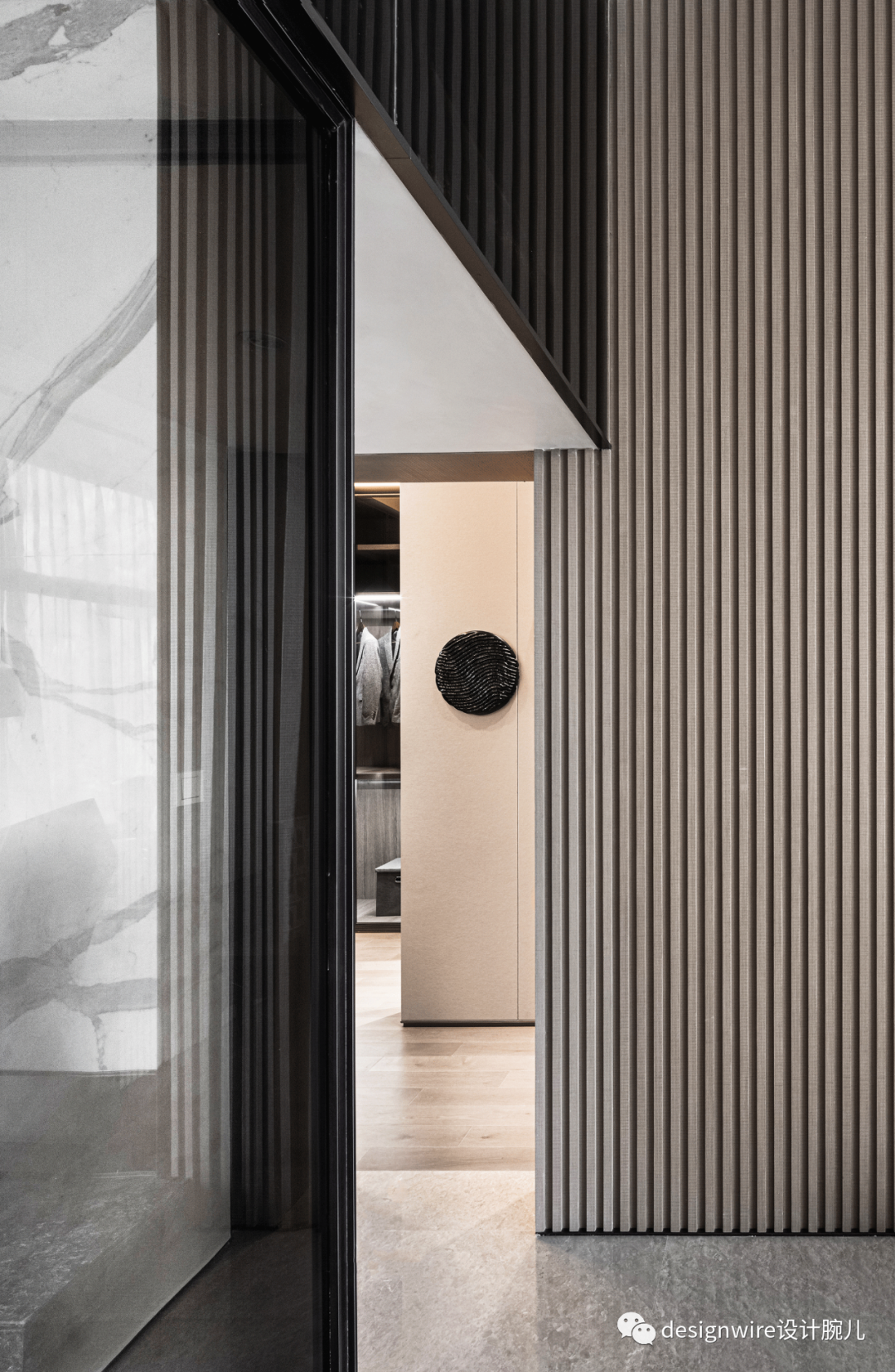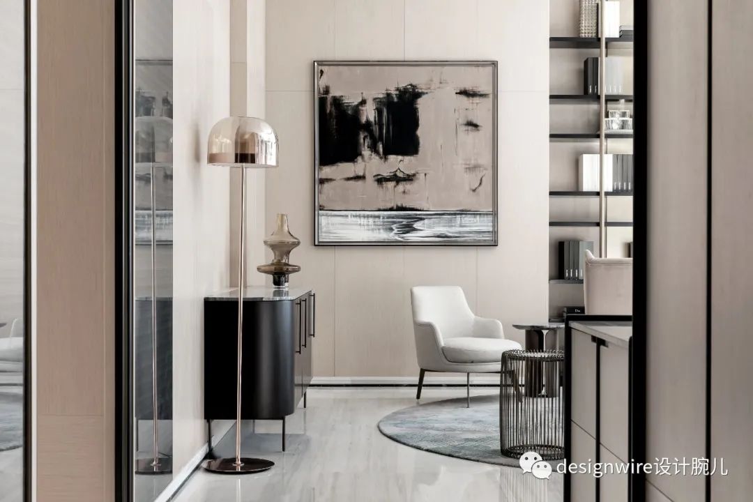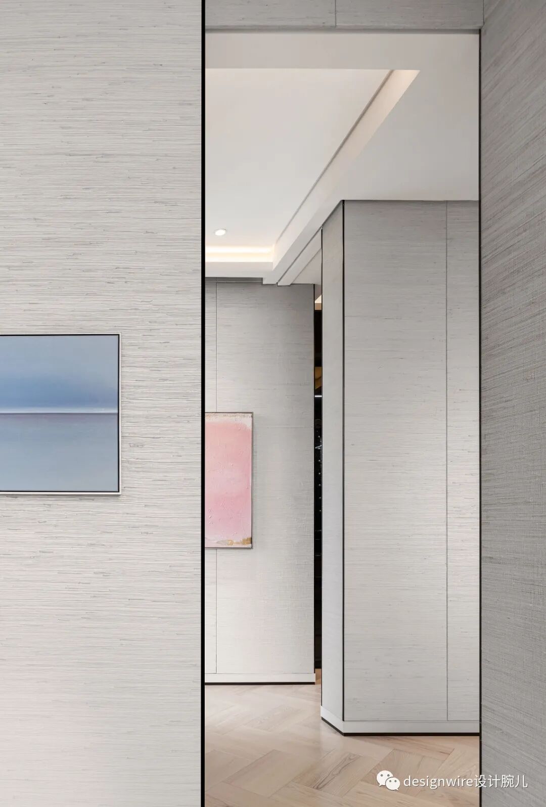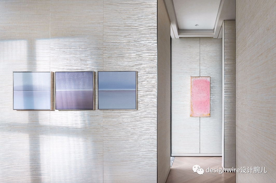 私密区虽流线通达,视觉上却尽显隐约,两重艺术墙饰掩隐入口,以弱对比色系,诉说一种克制的奢华。