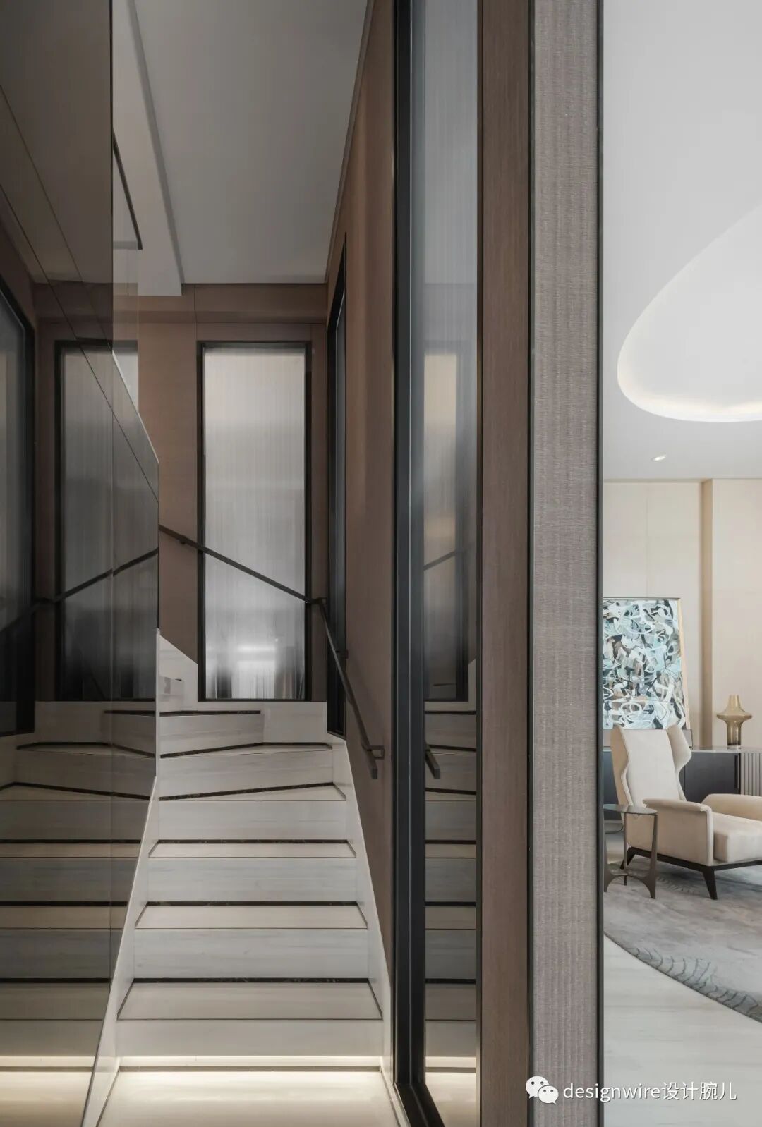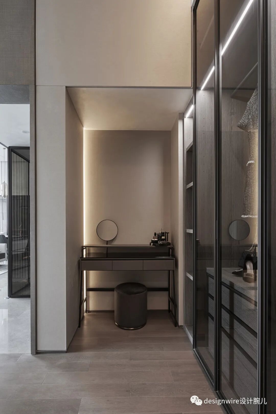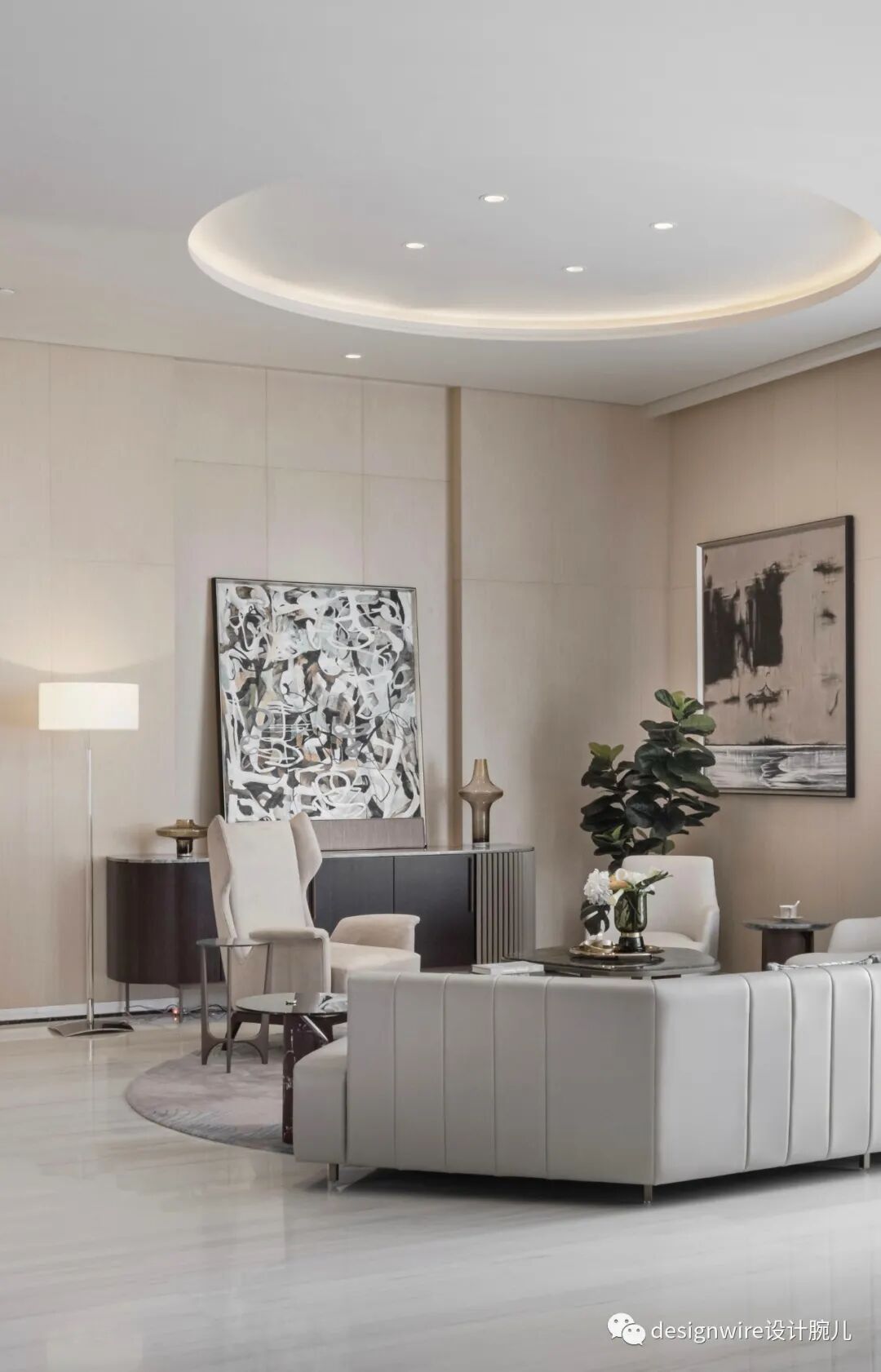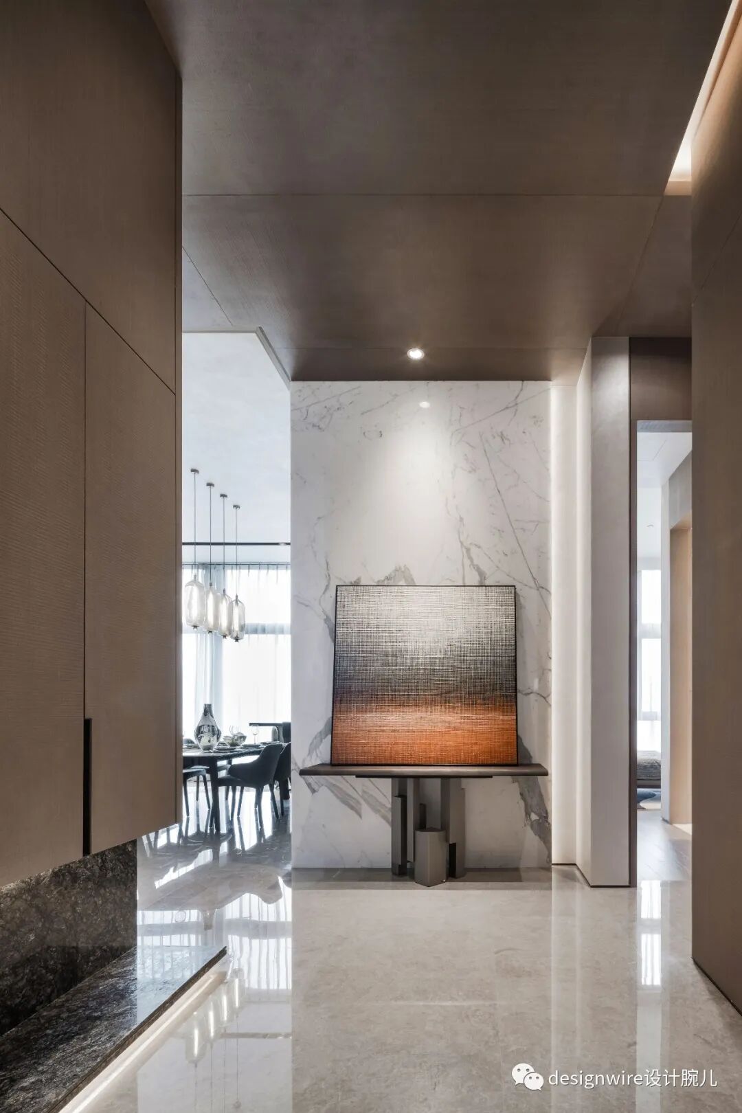 私密区虽流线通达,视觉上却尽显隐约,两重艺术墙饰掩隐入口,以弱对比色系,诉说一种克制的奢华。
