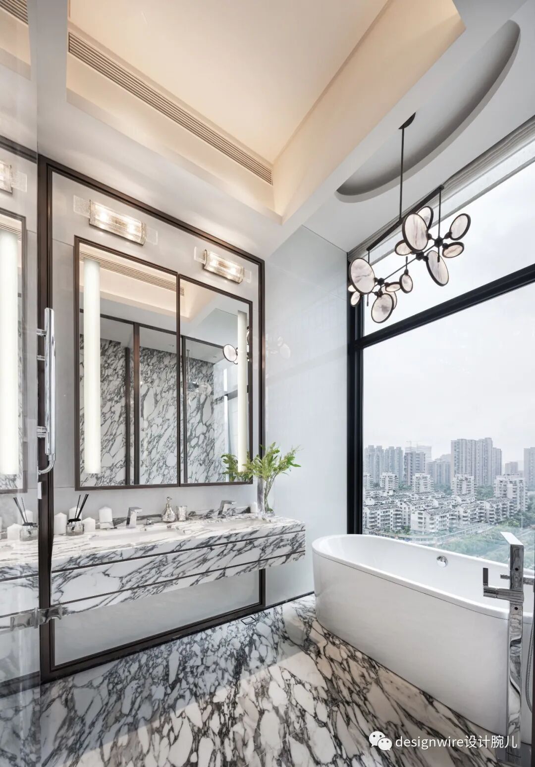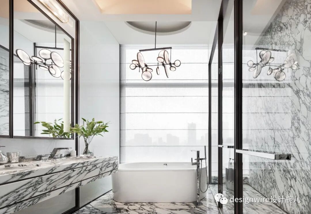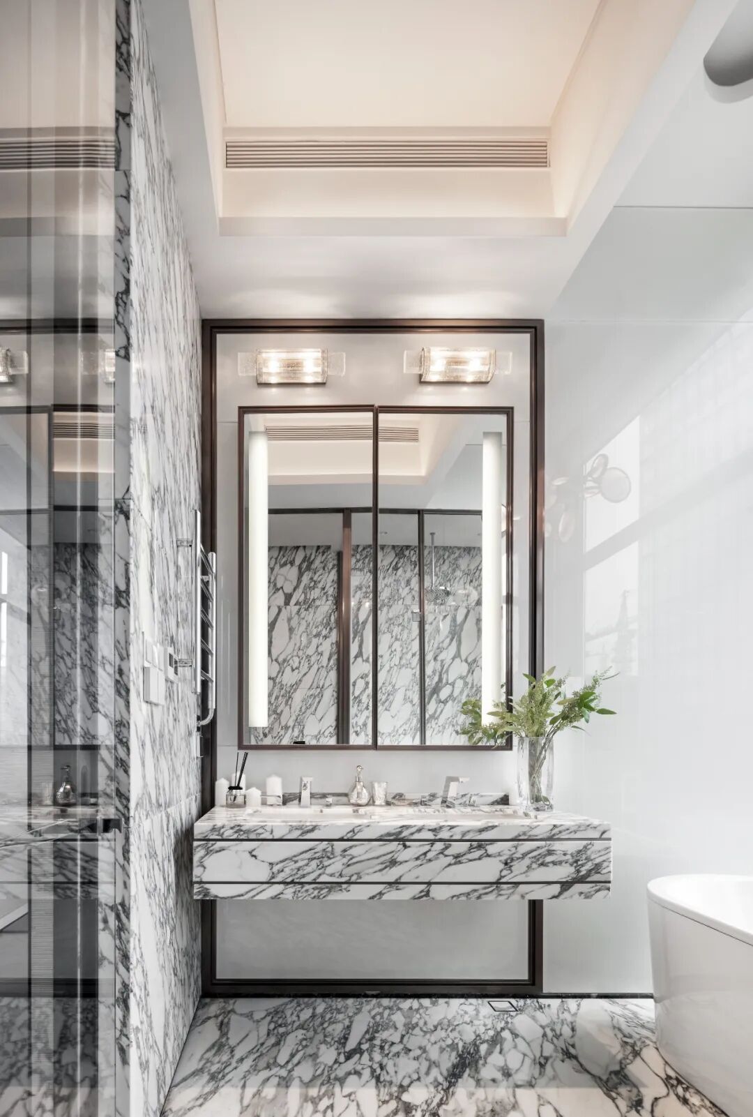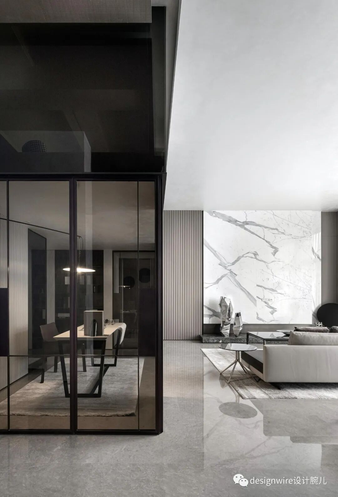 因为在设计师看来,天然材质所带有的自然痕迹与呼吸感,其独特的肌理与温度,才真正顺应现代人内心渴望的舒缓、平和、愉悦。饰面材料各异却气质相当,略施以变化,就将江南的烟雨,转换为大理石的白、灰、黑色泽。