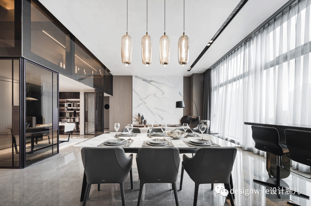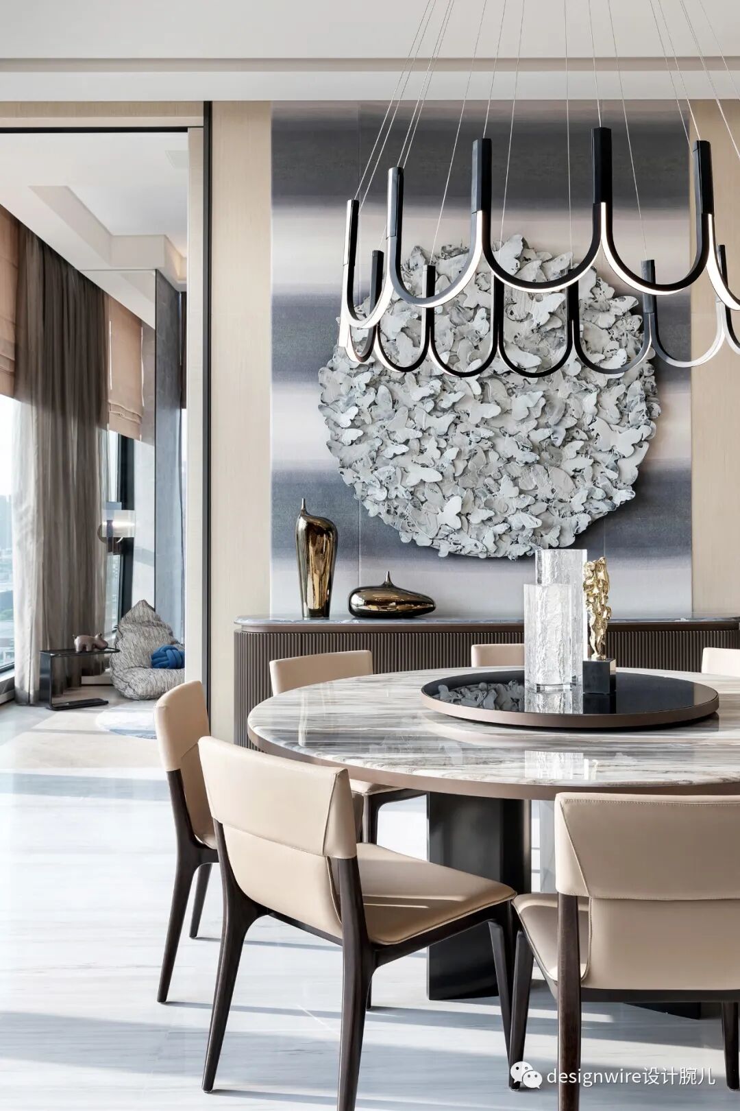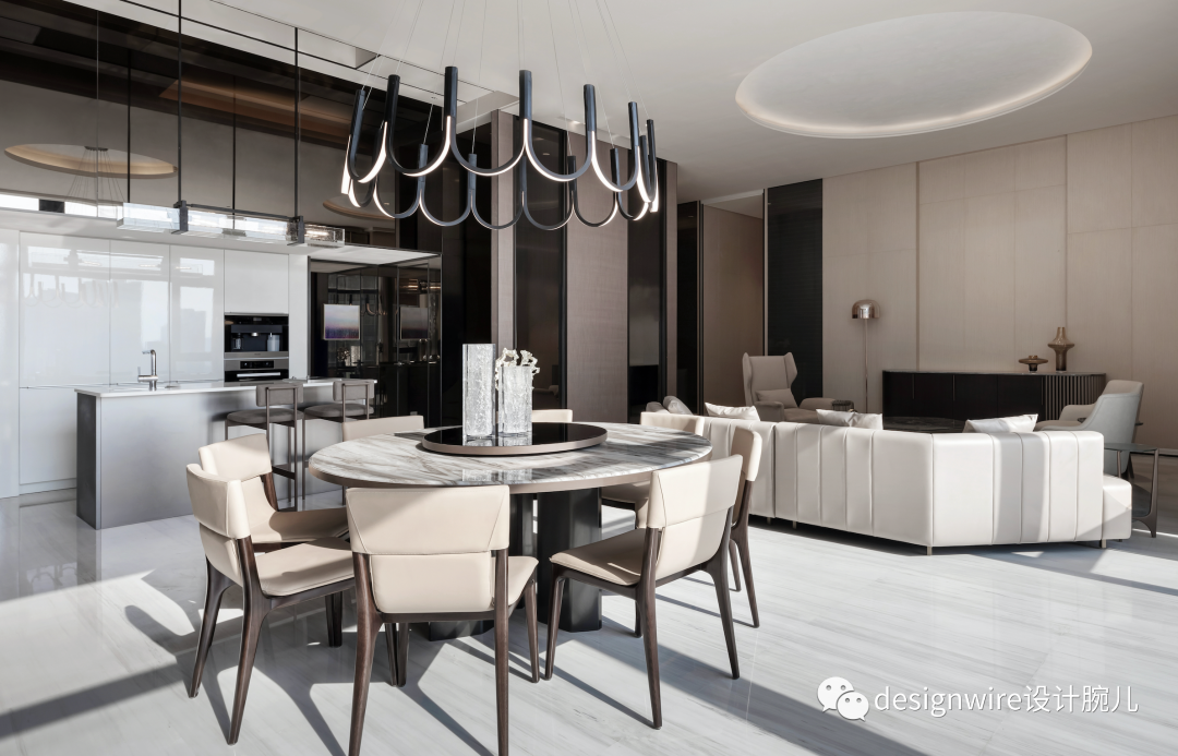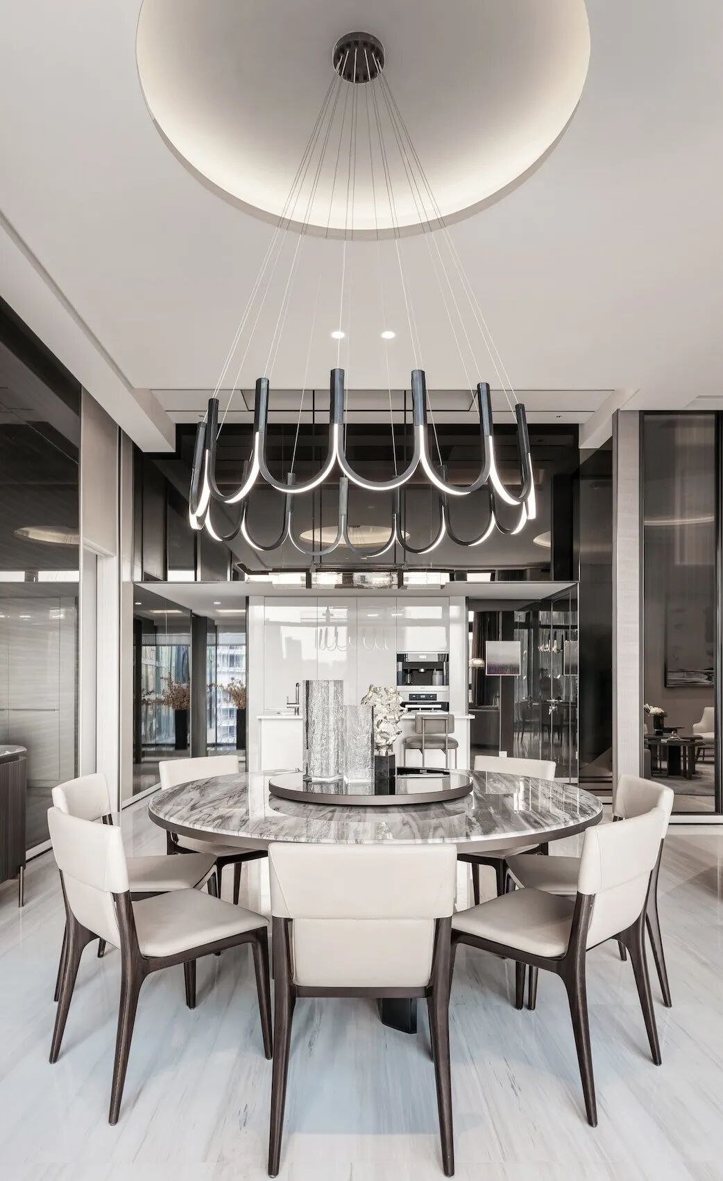 无论是大理石餐桌、环形排列吊灯,亦或是墙面艺术品,均中正圆融,规整的几何造型体现了东方主义的礼仪之道。