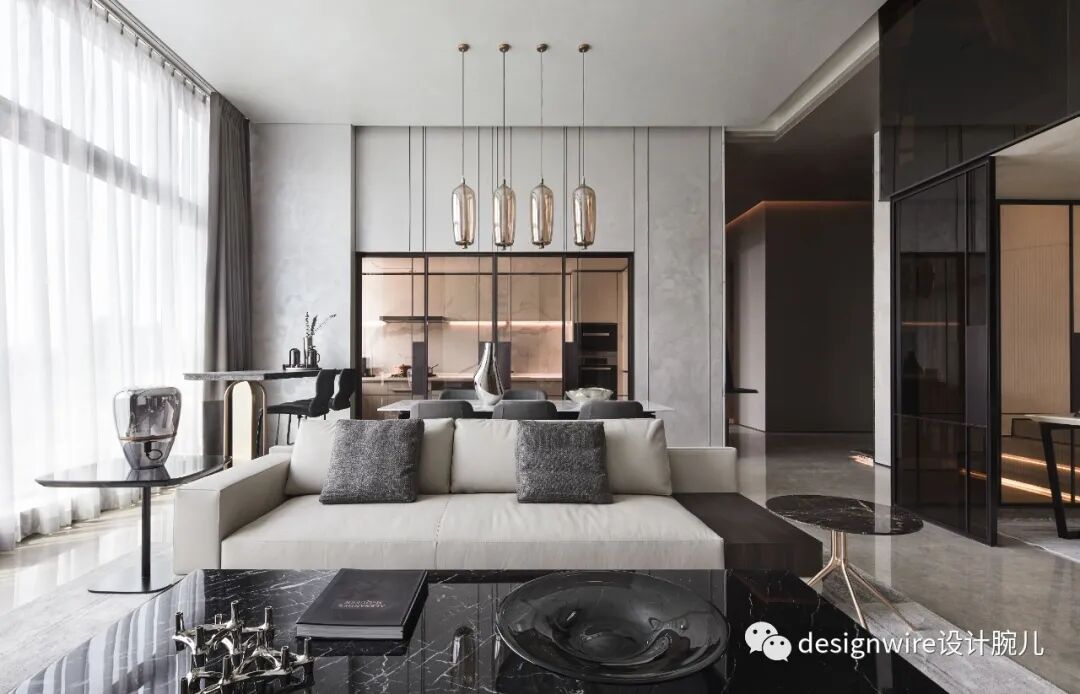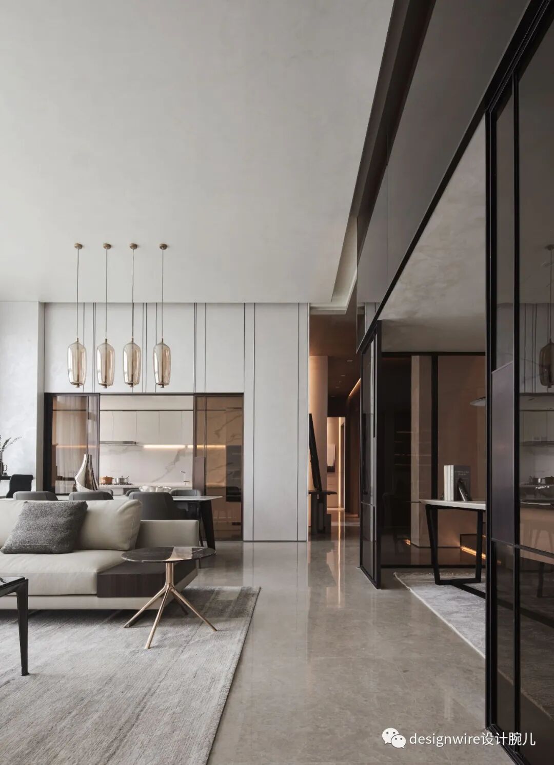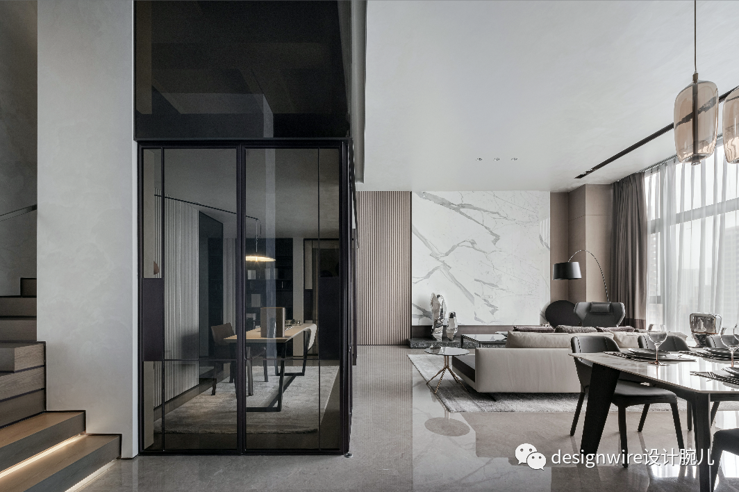 光连接了建筑和风景,大面宽与奢阔层高成为表达空间序列与光影质感的题材,大开间通透的设计令窗外景致一览无余。