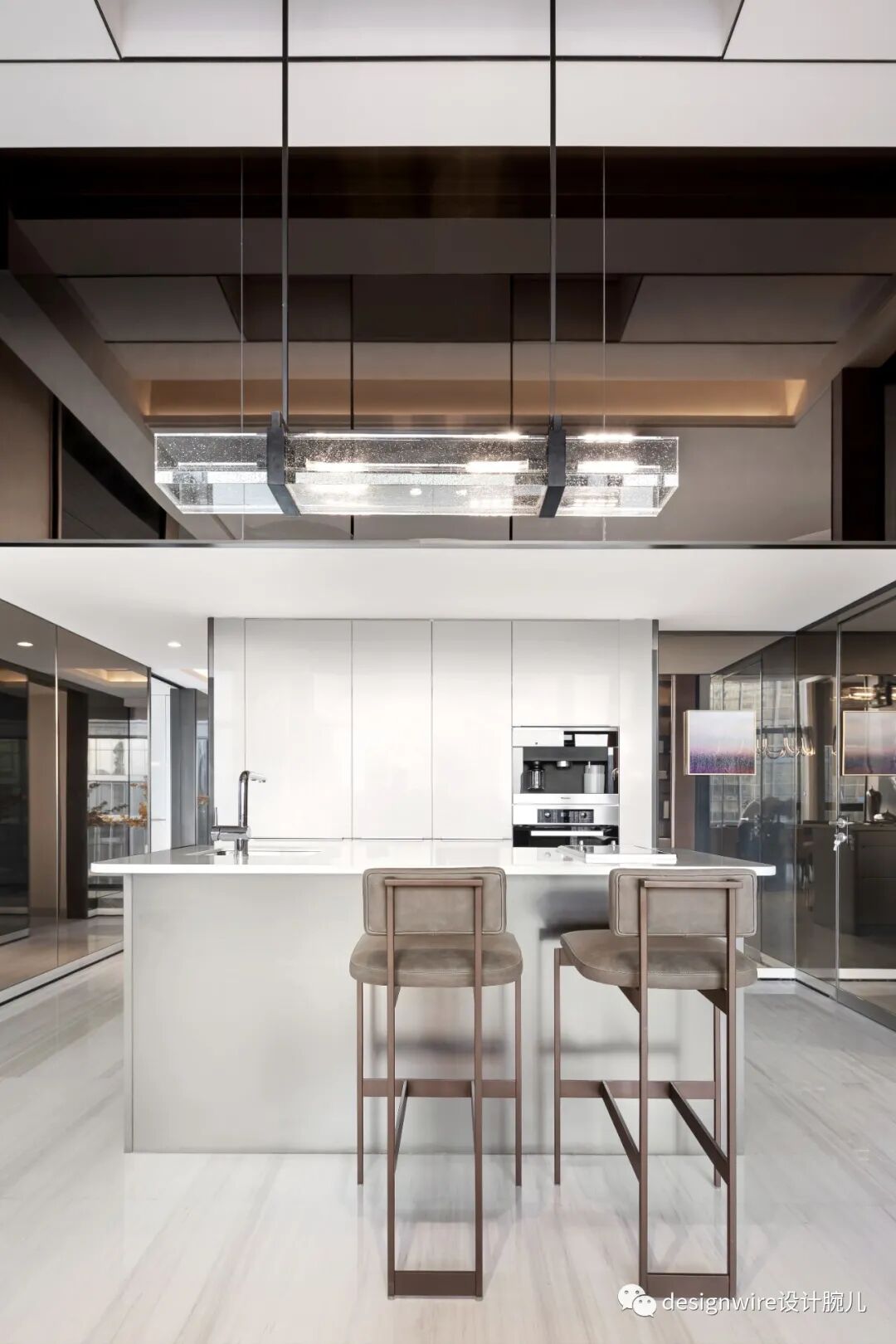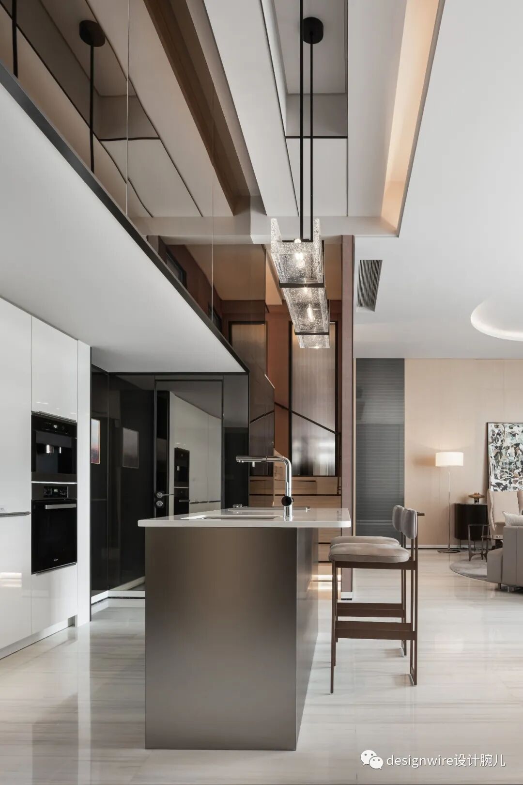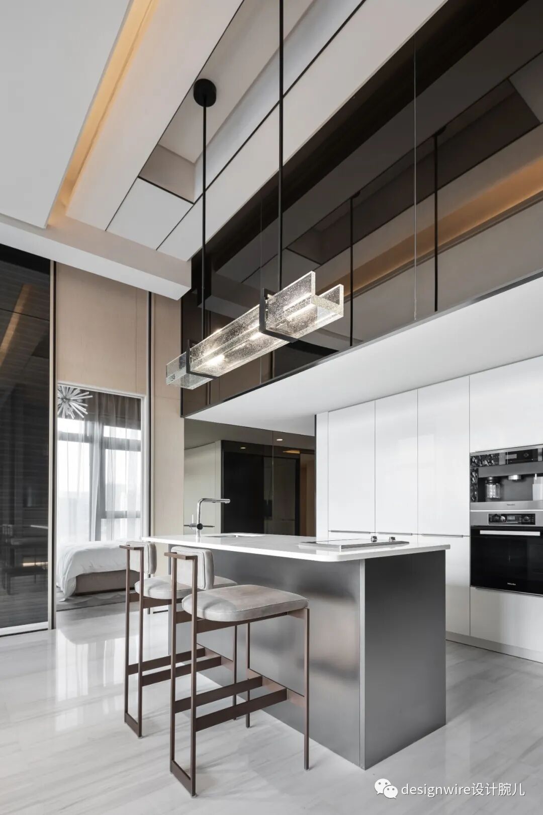 光连接了建筑和风景,大面宽与奢阔层高成为表达空间序列与光影质感的题材,大开间通透的设计令窗外景致一览无余。
