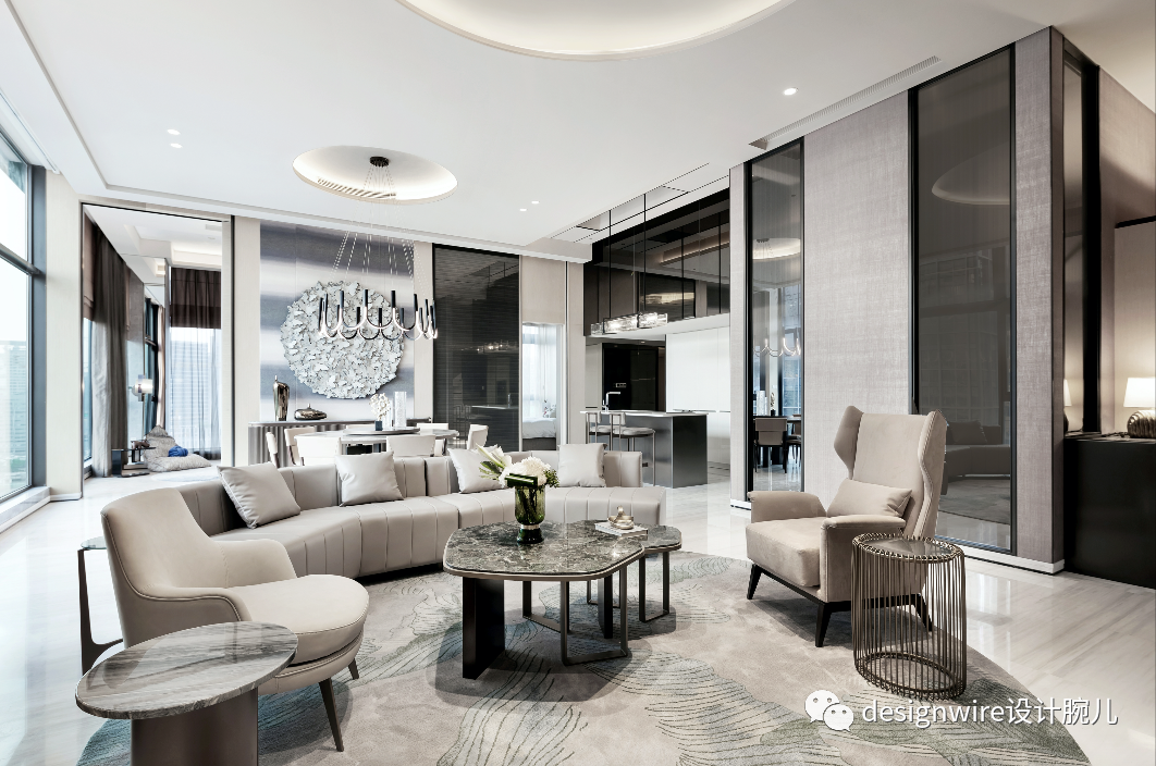 在设计师看来,One Room的理念未尝不是一种现代空间的设计趋势。超百平的餐客厅一体连通,空间使用者彼此照应,心意相通。
