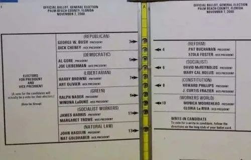 所谓“蝴蝶选票”,是指该选票上的人名和相应的打孔圈不在同一直线上,而是处于上下两位候选人的中间,这导致选民在选下面候选人的时候可能会误打上面候选人的圈。