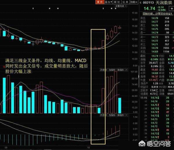 三线金叉指的是均价线微信公众号黑马速查、均量线、MACD。三者发出金叉信号。三者同时发出的金叉信号是非常强烈的买入信号。一买就涨!在技术分析中“价、量、时、空”这四大要素中有三个发出了买入信号,极大提高研判准确性的概率。一旦出现三线金叉形态,买入就能享受到快速拉升的机会。