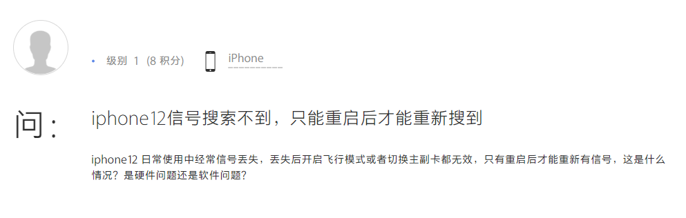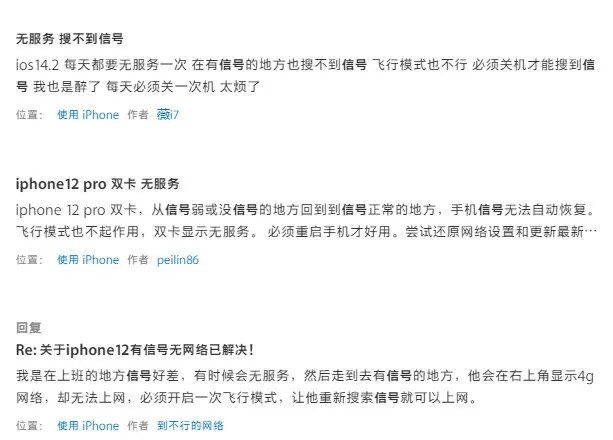 而国内不少 iPhone 12 系列用户也成为信号故障躺枪者。一些用户称,自己购买的 iPhone12 Pro Max 虽然信号显示是满格,但就是无法连网,直到关机重启后,手机才恢复正常。