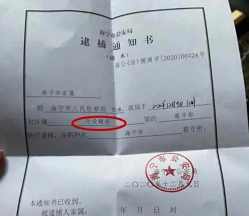 12月9日,浙江海宁市公安局发出一张逮捕通知书,蒋子华因涉嫌“开设赌场罪”被批捕。
