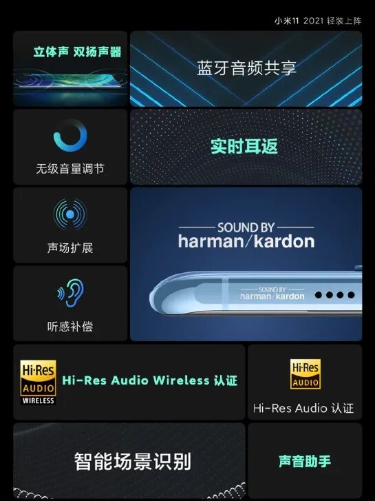 小米11与哈曼卡顿联合打造立体音效,哈曼金耳朵声学团队联合调校;立体声双扬声器,配合3D震感;支持蓝牙音频共享,同时连接两个蓝牙设备。
