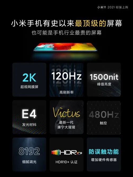 小米11采用四面小微曲AMOLED屏幕,2K超高分辨率,像素数提升1.8倍,E4最新材料,峰值亮度1500nit,8192级亮度调节,120Hz高刷,480Hz触控采样率。