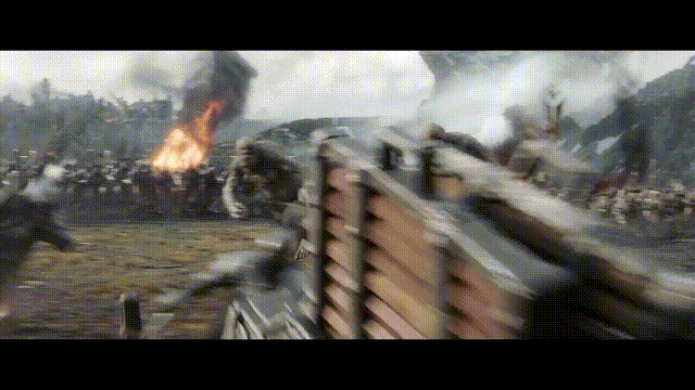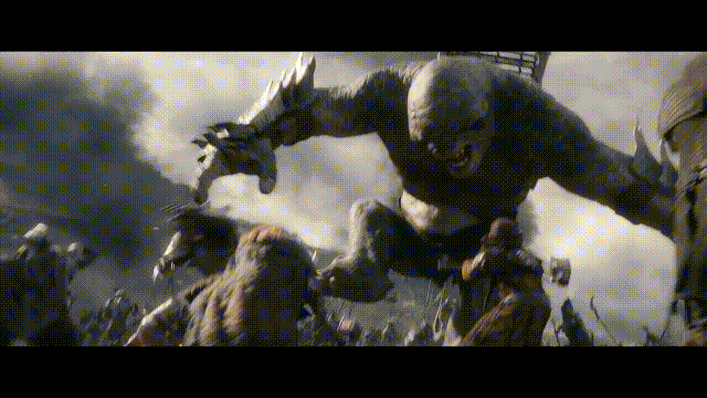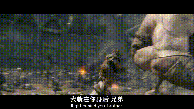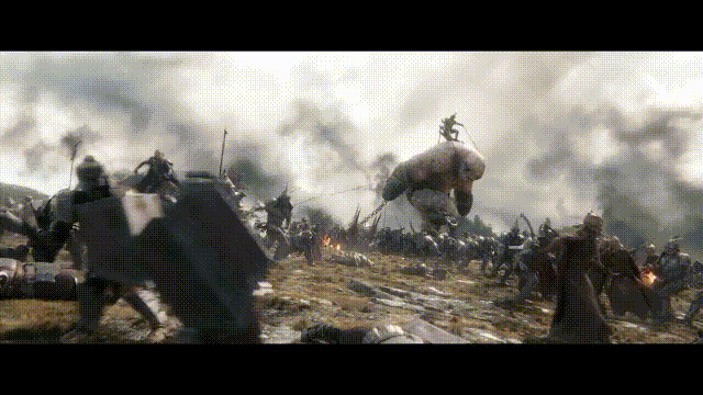 为了进一步体现矮人重新获得的优势,导演特意还放倒了一只巨兽。然后让它被背上的投石机弹起来,再砸飞一些杂兵。从镜头里,我们看不出来是矮人一方的任何攻击表现造成了这一点,这更像是一个偶然的结果,但是这种随机性的添加,显然是有助于剧情在这里的上升情绪的。