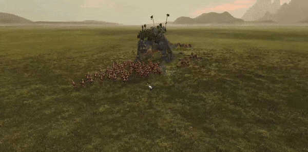 我们几乎可以设想这样一个场景,在开发的早期,CA的程序员拿着祖传的游戏引擎,导入单调的素模或者来自《阿提拉:全面战争》的旧模型,然后开始摆弄物理系统的参数们。当看到小人们像弹球一样起飞时,他叫来旁边的同事看,然后他们一起激动地大笑。如果一款游戏在还没加入什么美术素材时就已经看起来很爽了,那么加入炫酷的动画、精美的模型和特效,只会让效果变得更好。