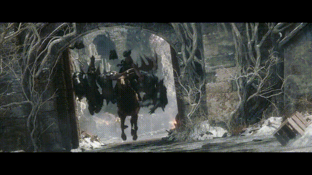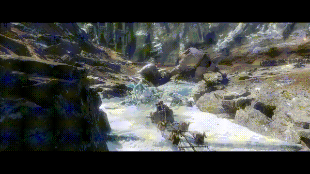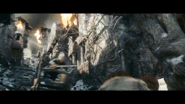 而同时,我们可以用借鉴本片用来凸显物理碰撞和偏袒单体的一些手段。例如,精灵人肉减速带的设计是一个非常有创意的安排,它同时展示了大型单位的破阵威力,步兵的应对方法,以及精灵独特的军事理念;再比如,本片通过使用坐骑的方式,将小体型的单体单位变成大型单位,从而增加他们的战场影响力;甚至设置了临时的坐骑(巴德的飞车)以及缴获自对方的大型单位(波佛的巨怪)。