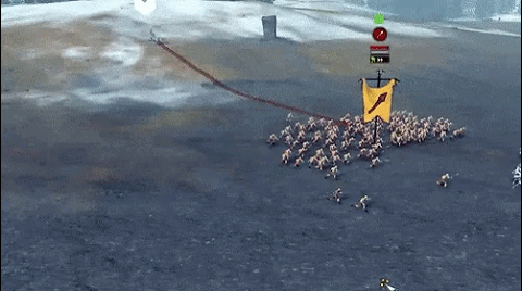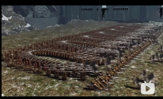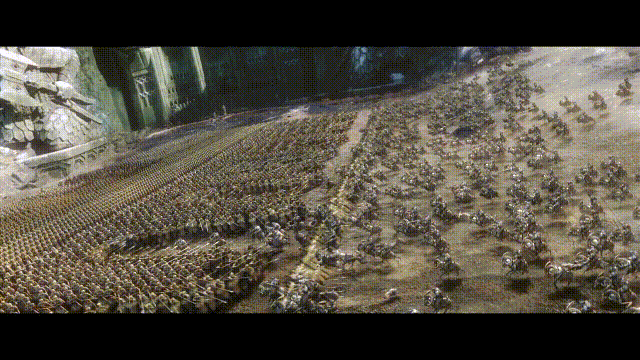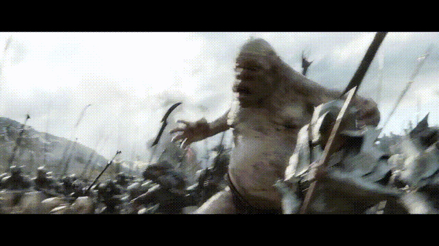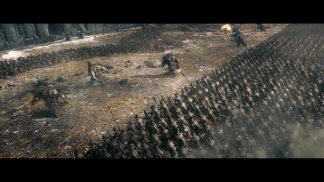 我们可以看到,导演PJ和摄制组选择的思路和《战锤:全面战争》有着某种相似性:通过对物理碰撞的夸张化处理,将战场阵型的对抗转变成大质量、大体型单位的对抗。确切的说,双方在战局中都在不断解决这样一个问题:如何遏止对方的大型部队对我方军阵的突破,同时使我方的大型部队能够安心突破敌方的阵线。