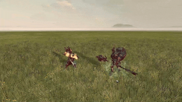而战锤却大大减弱了这种同步动画的存在。在大多数时候,无论是小兵和小兵对打,还是领主和领主对打,乃至巨兽的攻击,都是“空气剑“。单位会对着对方所处的位置(判定框)挥出一击,然后受击方播放一个常规的、无衔接的受击动画(有时甚至没有受击反馈动画)。
