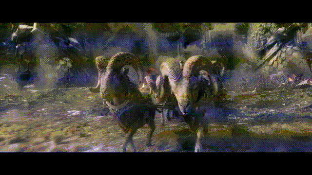 在突围之后,索林决定带领亲卫队来个擒贼先擒王,直接杀向阿佐格的本部,击杀对方。而为了实现这一点,他需要什么呢?根据片子的逻辑,很明显——用来冲破敌阵的大型单位。于是,我们看到,索林骑上了不知道从哪冒出来的山羊,而他的跟随者则跨上了山羊战车。他们摇身一变,成了大型单位,他们对于战局的影响力被大大加强了。
