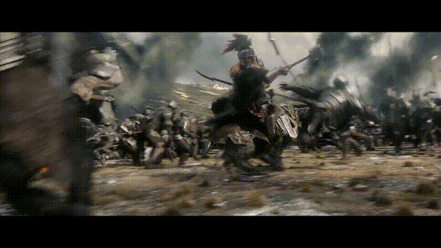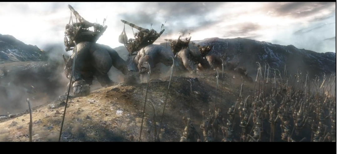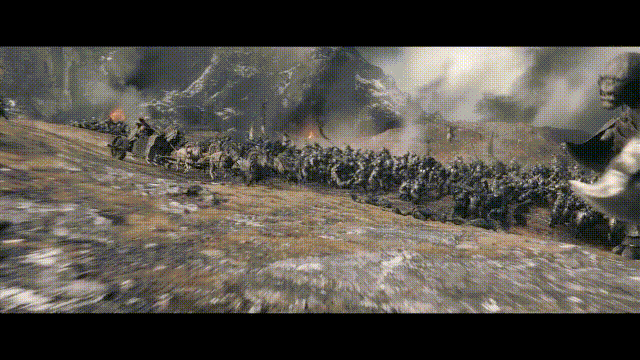 根据分析《霍比特人3:五军之战》中战争场面的设计和调度。我们一方面可以印证来自《战锤:全面战争》的经验,即在奇幻战争场面中,传统的军阵和布局在一定程度上被弱化,而为了视觉上的观赏性和表达上的明确性,场面调度的重心可以转移到夸张化的物理碰撞与大型单位这两个要素上。大型单位的出现、破阵、对抗和损失,都可以成为战局中情绪变动的关键点。