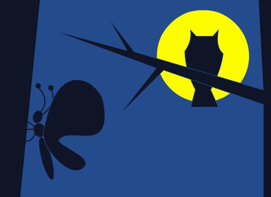 视觉经验告诉我们,人的视觉倾向于注意到对比强烈的图像,但是在此之上,人(和其他很多动物)更容易注意到的是运动的物体。正如下图,即使猫头鹰的剪影和月亮有着最强烈的对比,大家的视线还是会被蝴蝶所吸引。