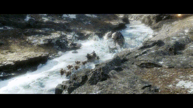 根据霍比特人的官方纪录片,一开始的这个桥段,是没有精灵结阵形成的第一层减速带的,然而,摄制组经过研究,还是选择加入了这条“人肉减速带”。