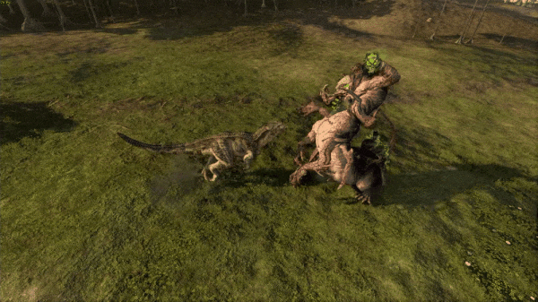 而巨兽之间,则会产生更多的特殊攻击动画。例如,图示的暴龙跳到了地狱深坑憎恶的身上进行了特殊攻击,而憎恶的动画与之完全匹配。之所以给巨兽安排了这样的动画,原因也很简单,即使是玩家把镜头拉到最高的情况,这样的动画也能够被清楚地看到,那么在此加大投入,也是合情合理的。这也是对巨兽单体单位的另一种偏袒,具体的效果,我们在后面的例子中可以看到。