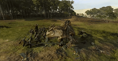 而在面对诸如恐蜥这种超重型巨兽(质量12000)的时候,步兵像被吹飞的小纸片一样四处乱飞,也是可以想见的结果了。