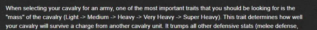 而在2014年的一篇帖子中,可以看到,在《罗马2:全面战争》中,mass使用的是枚举类型,也就是light,medium,heavy,very heavy, super heavy这5种。这和战锤的weight数据一模一样,但是和mass数据明显不同。不过,它所体现的作用却比较类似mass(决定骑兵冲锋效果、单位推移等)。