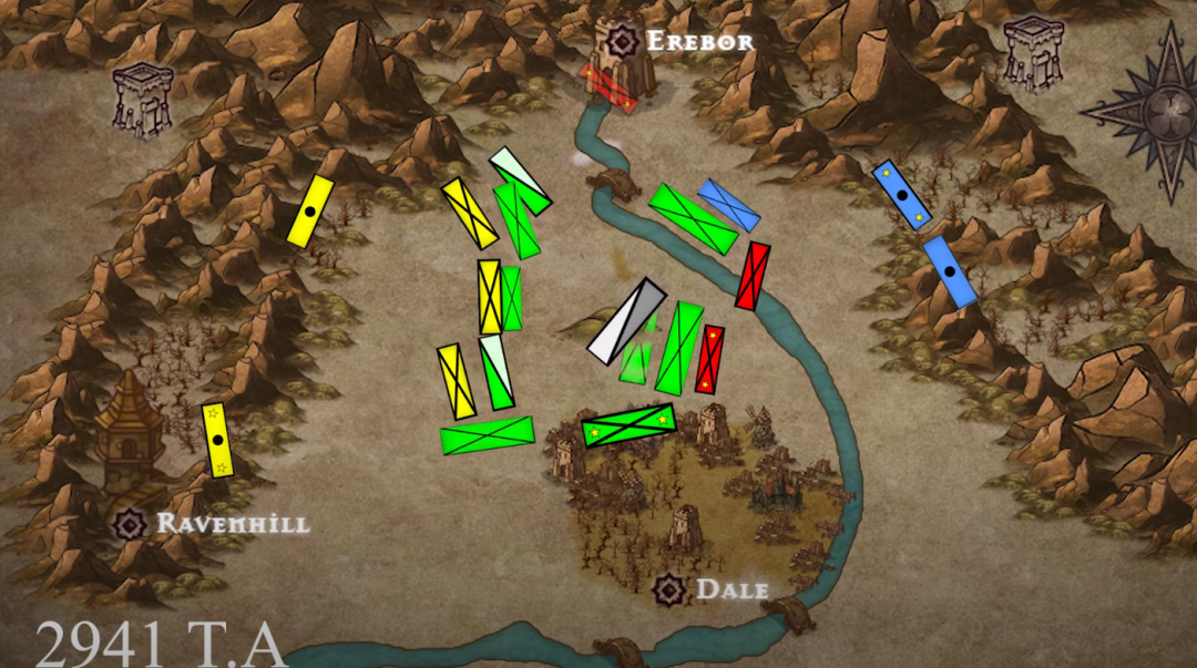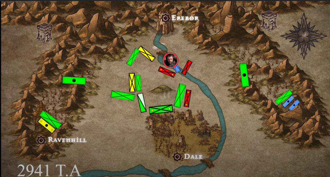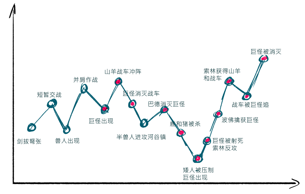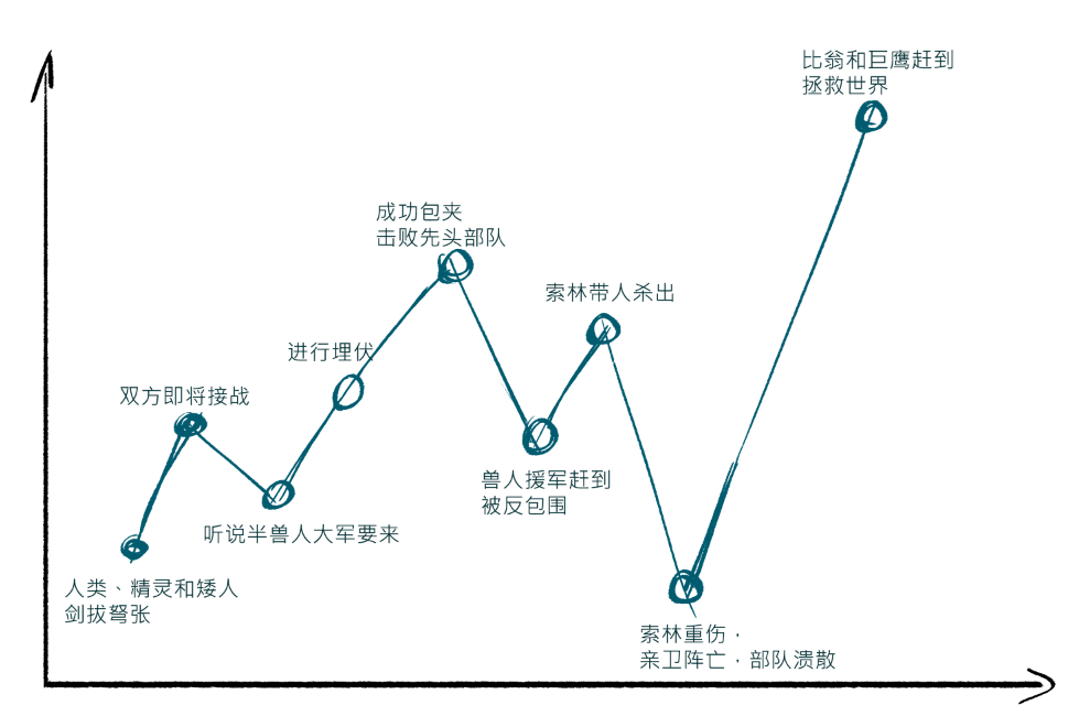 如果将原著中的战斗过程画成基于情绪曲线的story beats,那么大概会是上图的样子。我们可以看到,决定整个战场局势起伏的主要因素,是阵型关系的变化(包围、被包围)和绝对力量对比的变化(援军出现与否)。而故事的主人公比尔博,还在战斗中途就晕倒了,后面的战斗过程都是别人后来转述给他的。