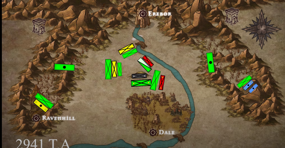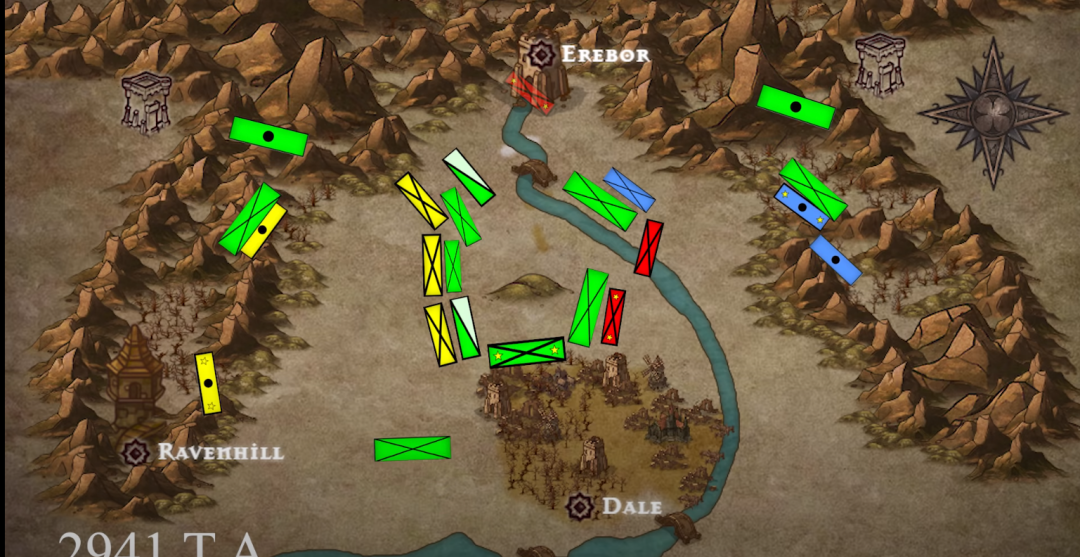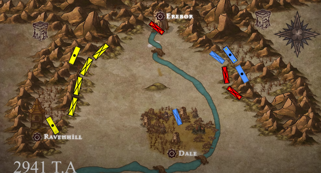 在矮人、人类与精灵三方短暂的对峙和试探性交火之后,巫师甘道夫出现,警告大家半兽人大军即将来袭,于是,精灵、矮人和人类组成统一的战线,向河谷两侧的山上进行机动和埋伏,准备居高临下,包夹半兽人。