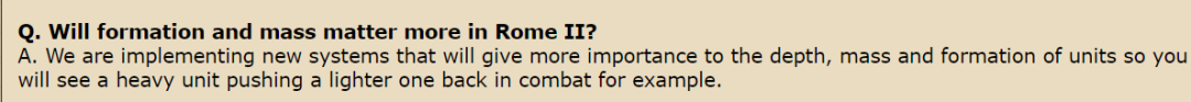 通过对totalwar.com论坛的搜索可以发现,在《战锤:全面战争》上市的2016年之前,mass和weight基本上是混用的。对战场有实际影响的质量系统(mass system)可能最先出现在《罗马2:全面战争》的更新中。在这篇2012年的Q&A里,开发者宣称,新添加的质量系统将允许重的单位推动轻的单位。