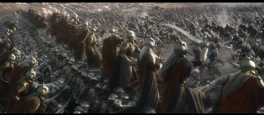 随后,就是著名的精灵从矮人头上跃起,冲入半兽人阵中的经典画面。