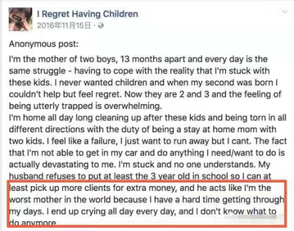 “我被两个孩子折磨得快疯了,丈夫却因为我不满意于现在的生活,觉得我不是一个称职的母亲。本来以为孩子是人生中的幸福,但是我现在每天都在哭。”