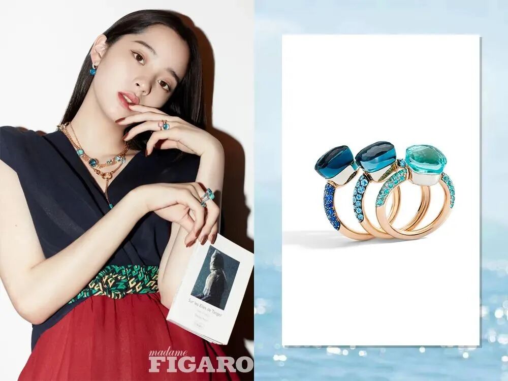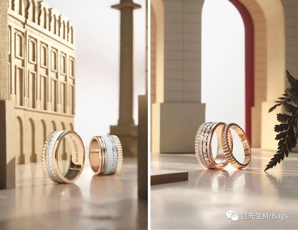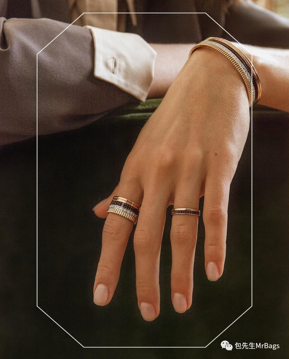 如果大家是第一次入手,想要一款既能体现工艺和品味,同时日常也能戴的布契拉提珠宝,我建议大家可以从Opera Tulle开始。Opera Tulle系列是在品牌经典的花卉造型上,融入了品牌最厉害、也最标志性的珠罗纱工艺。每个Opera Tulle系列的花朵,都是由彩色珐琅和金属蕾丝组合而成,真的是梦幻又通透。别看工艺很传统,但是Buccellati很敢用色。我就很爱这个绿色,戴起来特别潮!这两年,宝诗龙的人气越来越高,相比其他品牌,它已经算低调小众的珠宝品牌里比较出名的那个。而最当家的Quatre系列,基本是大家入手宝诗龙的首选。Quatre系列的戒指,由一个个不同材质的戒圈拼接而成。这四个圆环分别代表着宝诗龙四大经典建筑美学灵感:罗缎直线刻纹、钻石圈、巴黎饰纹和双圈同心圆。这样多层次的设计,真的蛮特别的,在整个珠宝界都非常少见。有点低调,又有着绝对的辨识度,同时很百搭,还时髦、前卫,让这款戒指特别受欢迎。今年,Quatre系列新推出了以蓝色为主题的Quatre Blue。