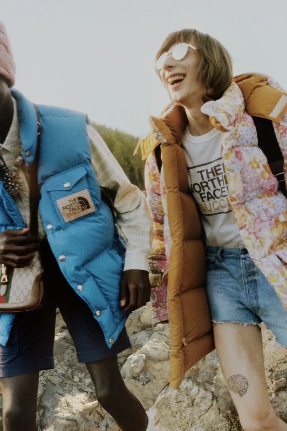 羽绒服剪裁以The North Face70年代的原始设计为蓝本,甚至还加入了The North Face x Gucci联名系列标志。