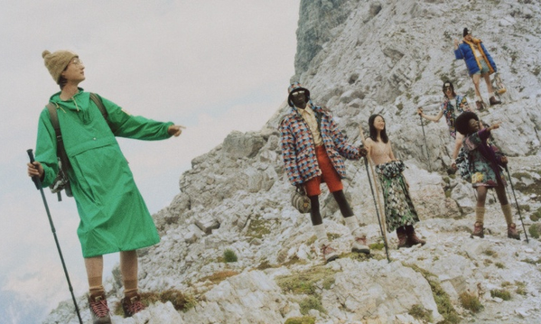 广告影片主角是一群登山者,身穿Gucci在山野湖边露营。阿尔卑斯山区的森林与山棱线组成了广阔而绝美的背景风景,缤纷而毫无矫饰的各种团体活动瞬间让人联想起度假的美好瞬间,充满印花的单品也在一片绿意中显得亮眼!