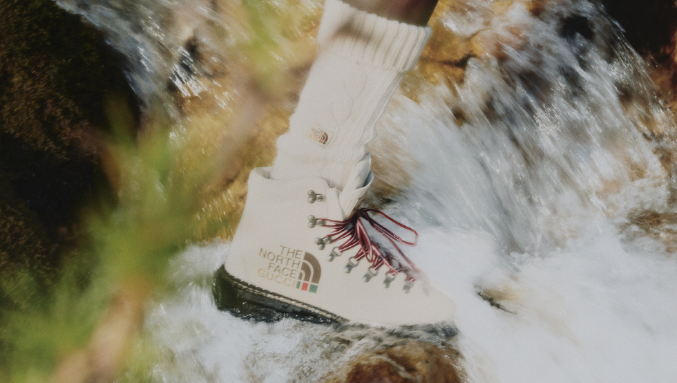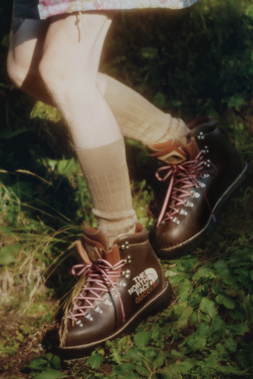 The North Face x Gucci联名标志印在靴子两侧,就连绳状条纹鞋带的配色都跟标志颜色相呼应!防水功能也让很多户外运动者爱不释手。