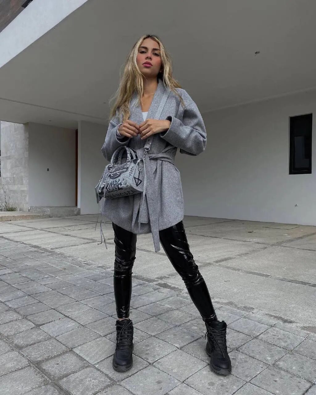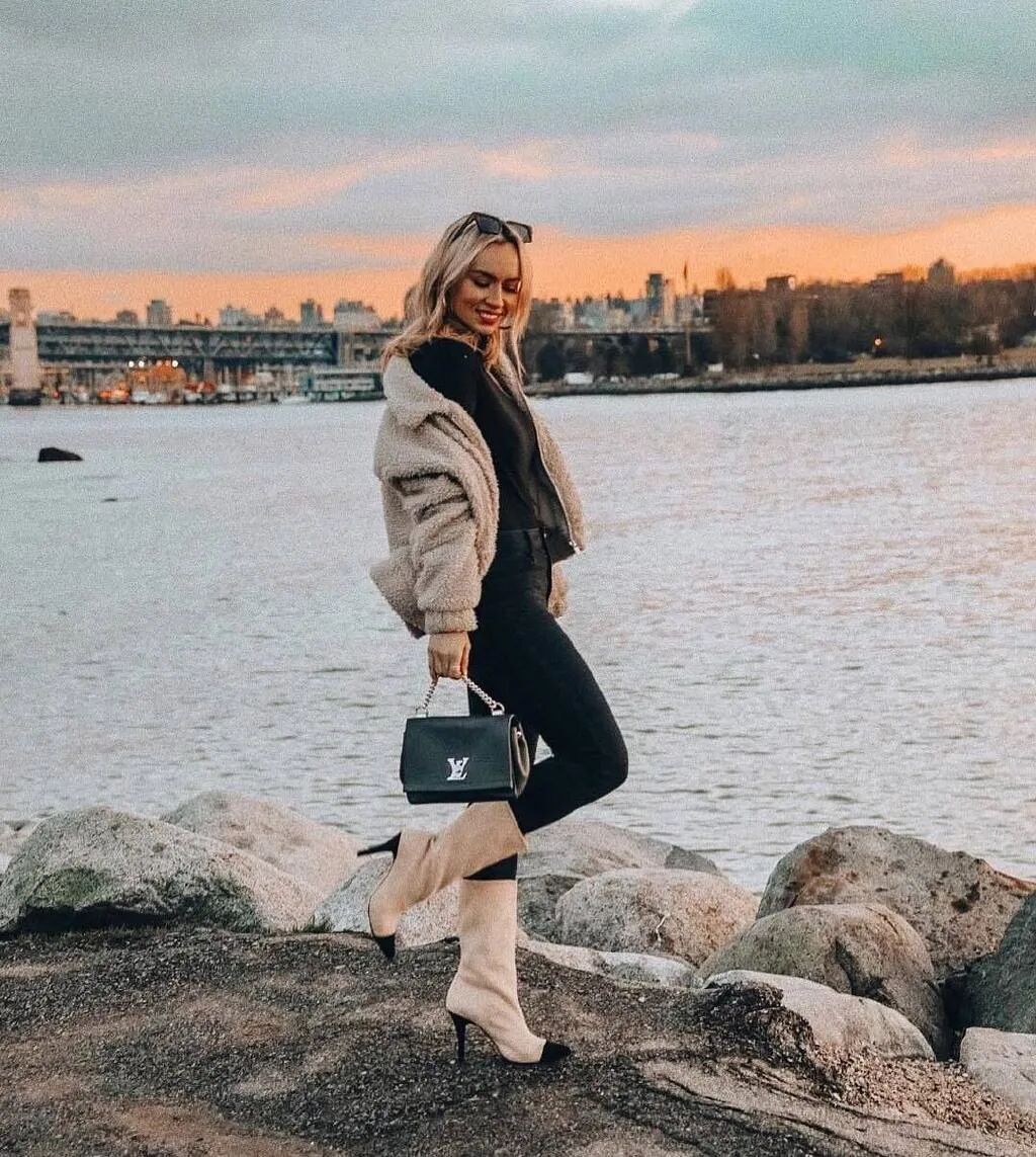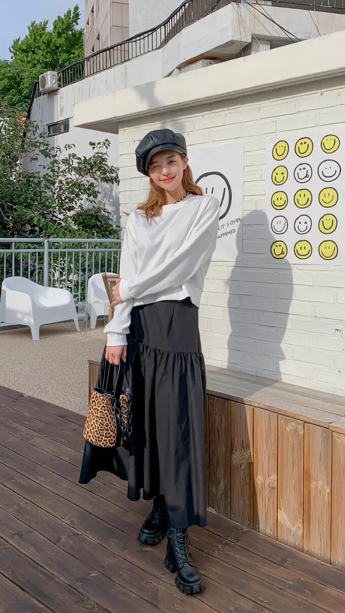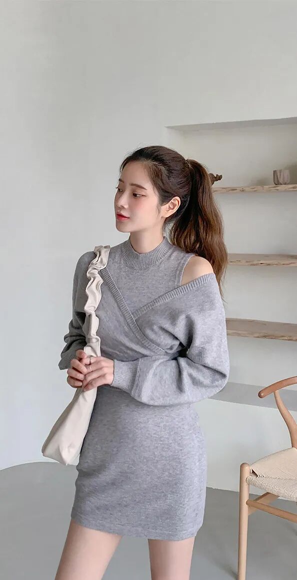 颇有设计感的灰色露肩修身连衣裙搭配白色弹力长筒靴,背一个花边可爱日系腋下包,瞬间显得俏皮又减龄。